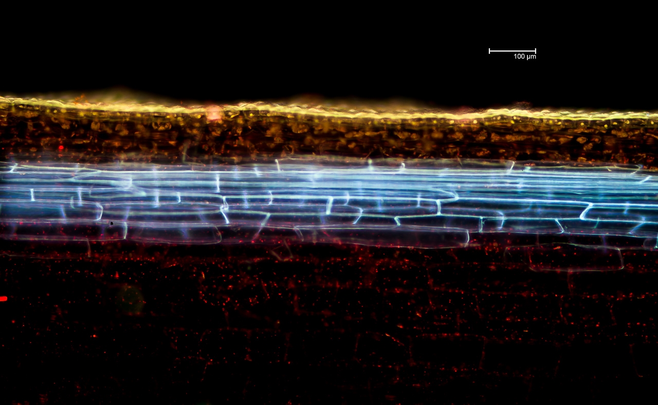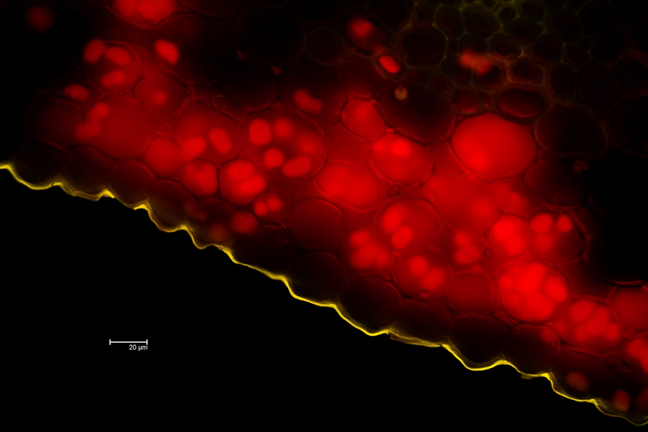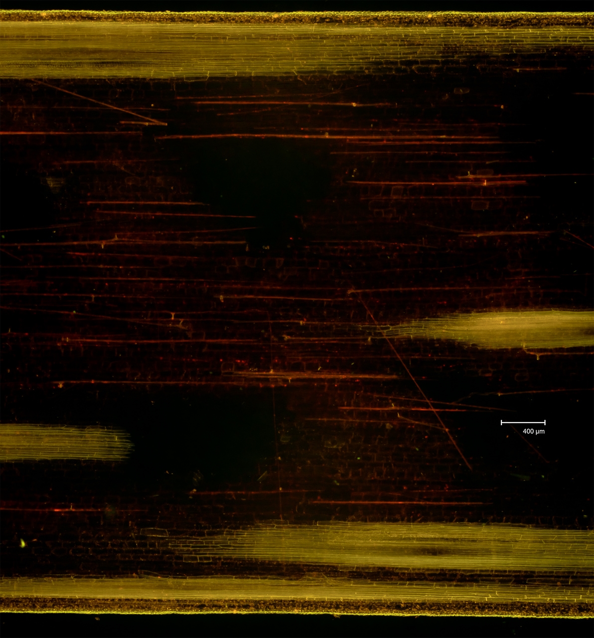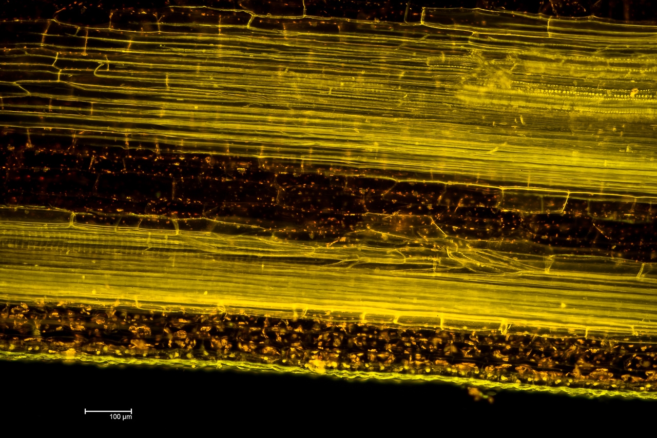 Sowohl in den Übersichtsaufnahmen, als auch in den Ausschnitten zeigen sich im Bereich der Epidermis immer wieder besonders hell fluoreszierende Stellen. Bild 7 zeigt einen weiter vergrößerten Ausschnitt des Abschlussgewebes. Man erkennt eine Epidermis auf der sich eine fluoreszierende Cuticula gebildet hat. Die in der Übersicht auffallenden hellen Spots sind Stomata, Bild 7 zeigt schön eine solche Spaltöffnung.