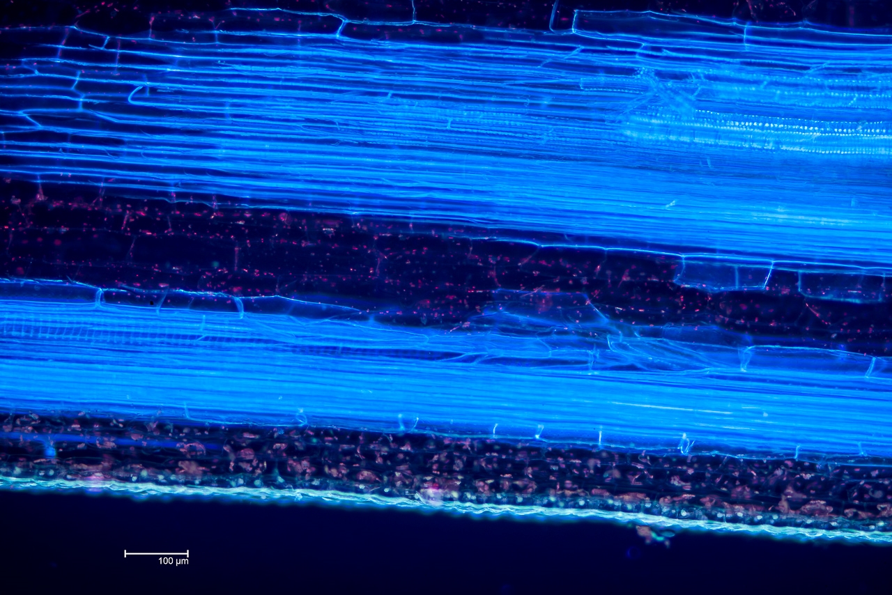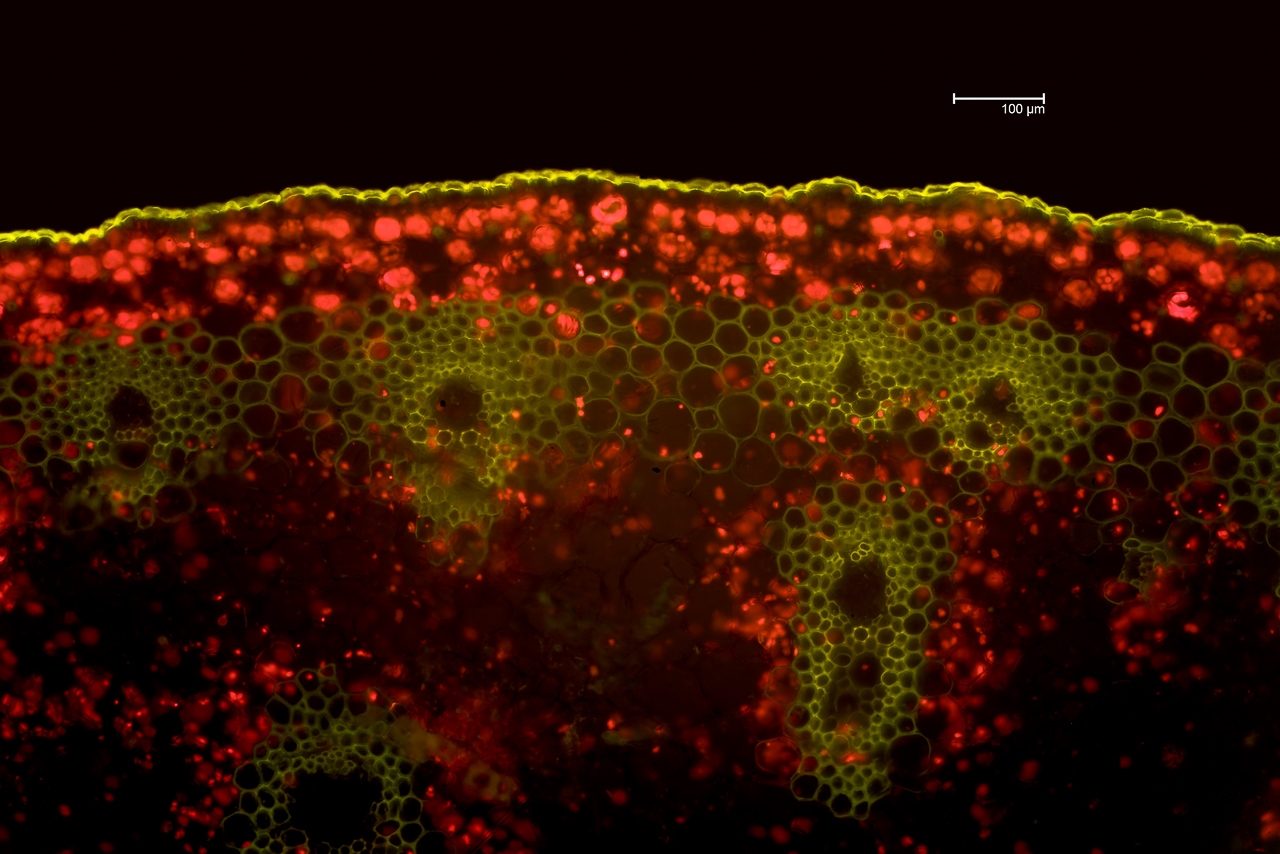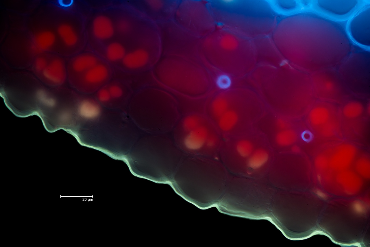 Interessante Details erschließen sich noch einmal in der AL-Fluoreszenz. Sowohl bei Blau- (Bild 24) als auch bei UV-Anregung (Bild 25) erkennt man schon die verholzten Strukturen der Leitbündel. Zusätzlich sieht man aber auch dünne, faserartige Strukturen mit einer Rotfluoreszenz.