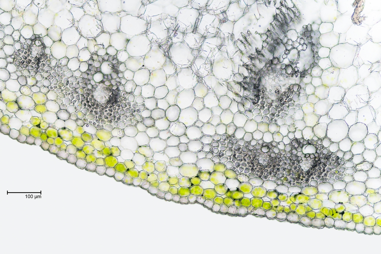 Bild 2 zeigt den ungefärbten Schnitt im Hellfeld, bei dem naturgemäß nicht viel zu sehen ist. Allerdings lässt sich bereits die grobe Aufteilung des Spross' erahnen: Man erkennt einen inneren Bereich mit vielen Leitbündeln. Es fällt sofort auf, dass diese zu einer Ataktostele angeordnet sind. Darüber hinaus erkennt man einen äußeren Leitbündelring. Und leider auch die oben angesprochenen ,,Löcher" im Bereich des Marks.