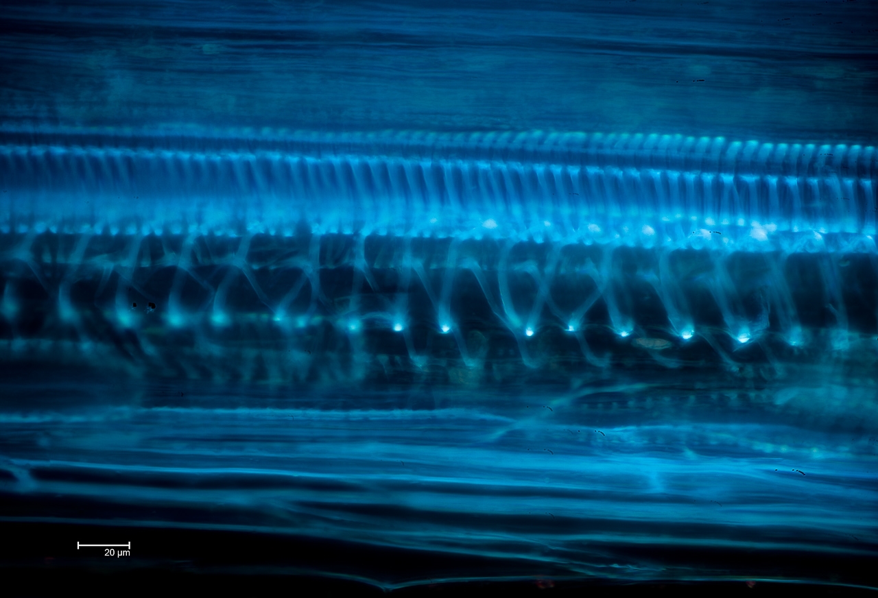 Bild 28: Detailaufnahme der Leitbündel in AL-FL , (UV-Anregung, EC-Plan Neofluar 10x/0.30, Stack aus 3 Aufnahmen, Abstand 3 µm)