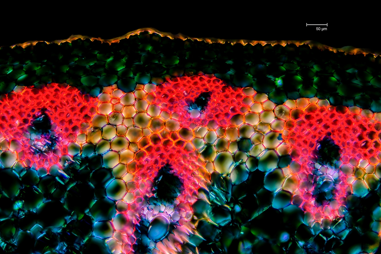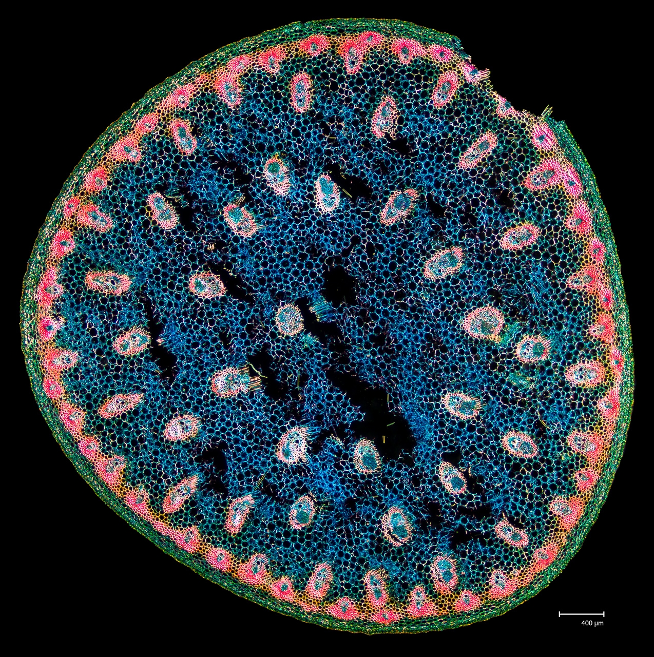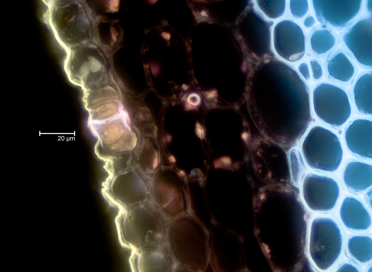 Was sieht man: Wenig Überraschendes. Wie bereits durch die intensiv fluoreszierenden Bereiche vermutet, haben wir einen hohen Anteil verholzter Zellen, die entsprechend gut rot eingefärbt werden. Sowohl im Leitbündelring als auch bei den einzelnen Leitbündeln innerhalb des Markparenchyms. Bei gekreuzter Polarisation leuchten auch wieder kleine Nadeln auf, wie sie auch in Bild 13 zu sehen waren, ein weiteres Indiz für Ca-Oxalat-Kristalle