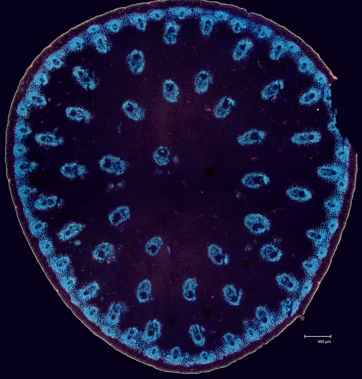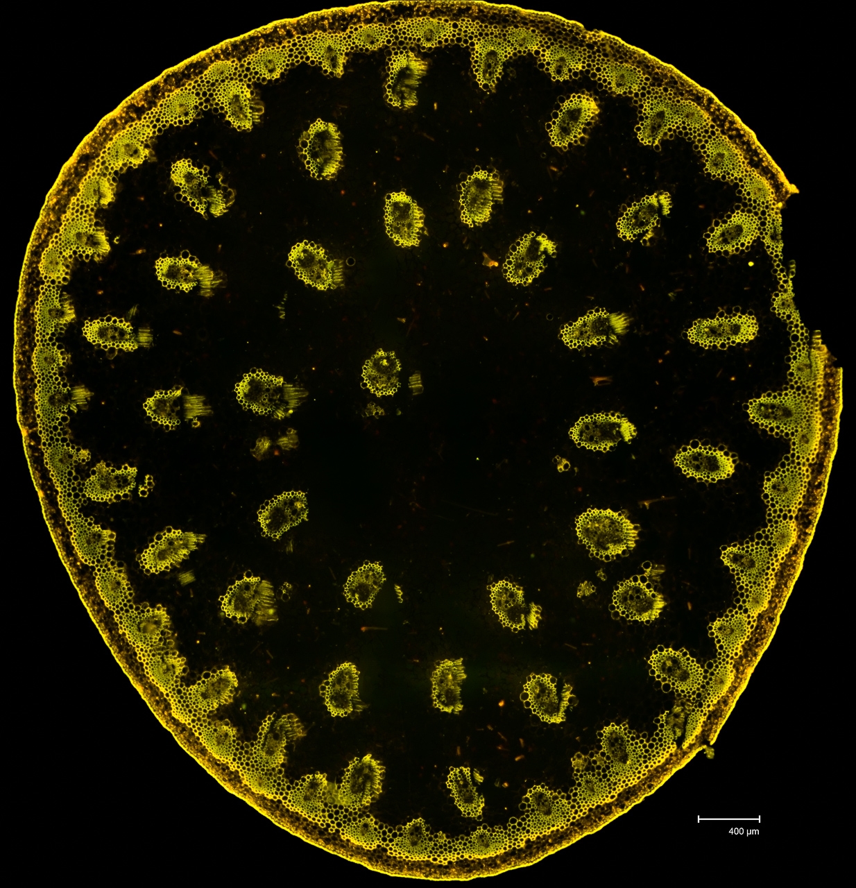 Weiter geht es mit gefärbten Schnitten. Zunächst erneut Übersichtsaufnahmen eines mit W3A-SimI gefärbten Schnitts (die Färbeprozedur hat dem Schnitt mechanisch nicht gut getan; im Vergleich zum ungefärbten Schnitt sind weitere Löcher im Bereich des Markparenchyms entstanden). Bild 15 zeigt die Panoübersicht im Hellfeld, Bild 16 im Dunkelfeld und Bild 17 bei gekreuzter Polarisation.