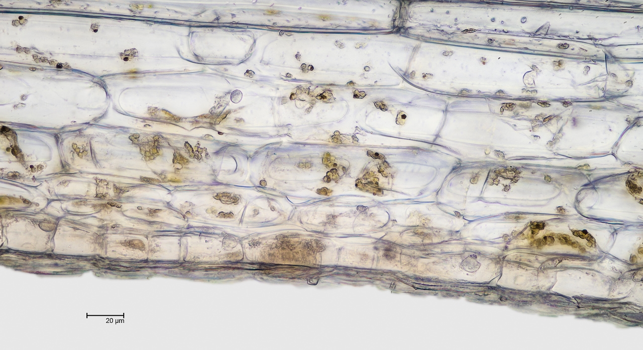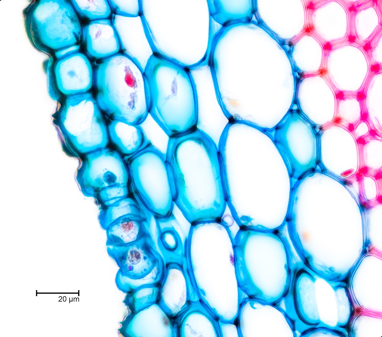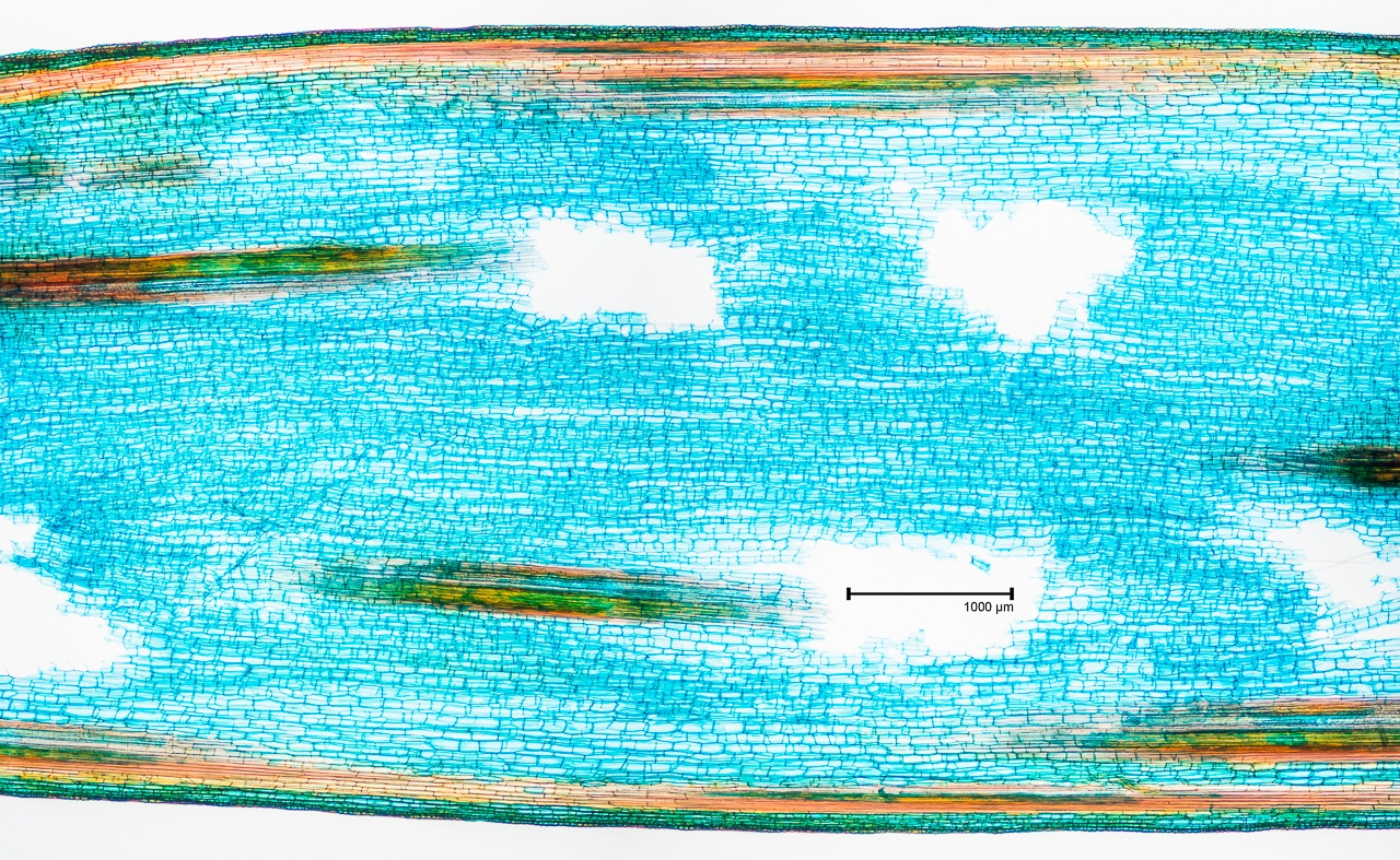 Für mich nun eine Premiere: Anfertigung von Längsschnitten! Dazu wurde ein Teil der AFE-fixierten Probe geschnitten und sofort in Wasser mikroskopiert, bzw. nach Färben in W3A-SimI und Eindecken in Euparal.