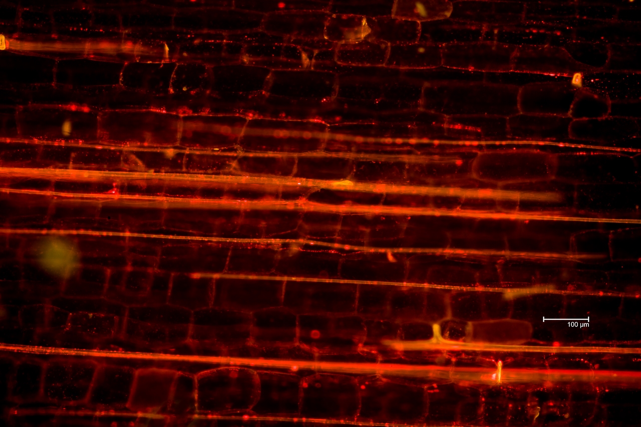 Bei einer stärkeren Vergrößerung (Bild 26) sieht man schön, dass sich hier neben des ,,Fasern" auch punktförmige Rotfluoreszenzquellen in den Zellwänden des Markparenchyms zeigen.
