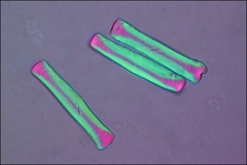 Im Schnitt tauchen dann diese anisotropen Strukturen auf. Kristallin (vermeine sogar Zwillinge zu ,,sehen") oder sklerenchymatisch – ich bin hin- und hergerissen: