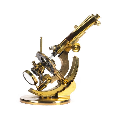 das Mikroskop läßt sich offenbar auf einer Kreisbahn um das zu beobachtende Objekt herum drehen und der Drehwinkel läßt sich ablesen. Da es über einen Spiegel und einen Kondensor beleuchtet wird, muß sich die Lichtquelle wohl mitgedreht haben und es war wohl für Durchlichtbeobachtungen gedacht. Die Lichtquelle war wohl in der Klemmhalterung angebracht. Abgebildet sind Präparate-Klammern und ein Objektträger. Das macht für mich jetzt noch keinen Sinn, außerdem warum dreht man das Mikroskop um das Objekt anstatt das Objekt unter dem Mikroskop zu drehen?