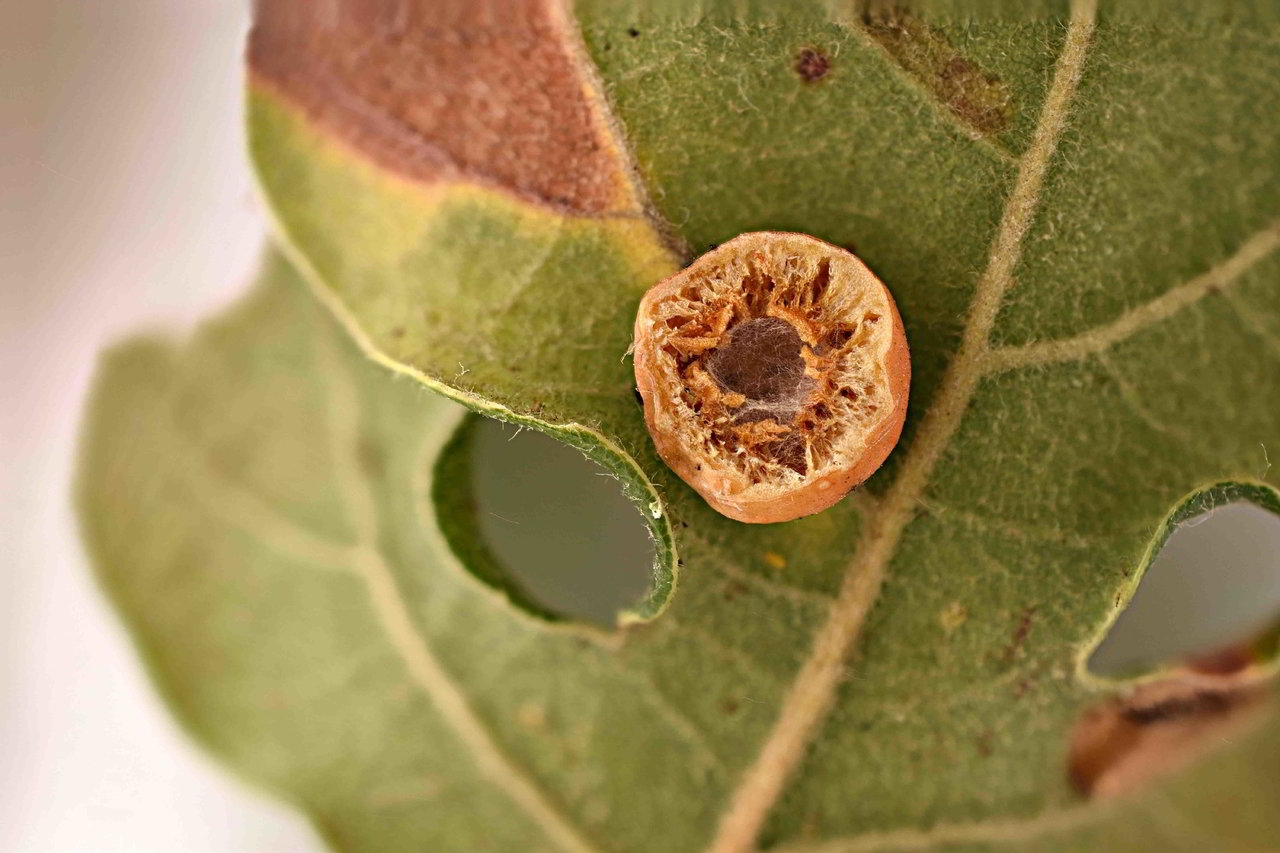 Die Innenseite der Galle ist mit einer gespinstartigen Struktur ausgekleidet (auch in Bild 2 zu sehen). Ich bin mir nicht sicher, ob das ein Gespinst der Gallwespenlarve ist, oder eine Bildung der Galle, oder ein Pilz.