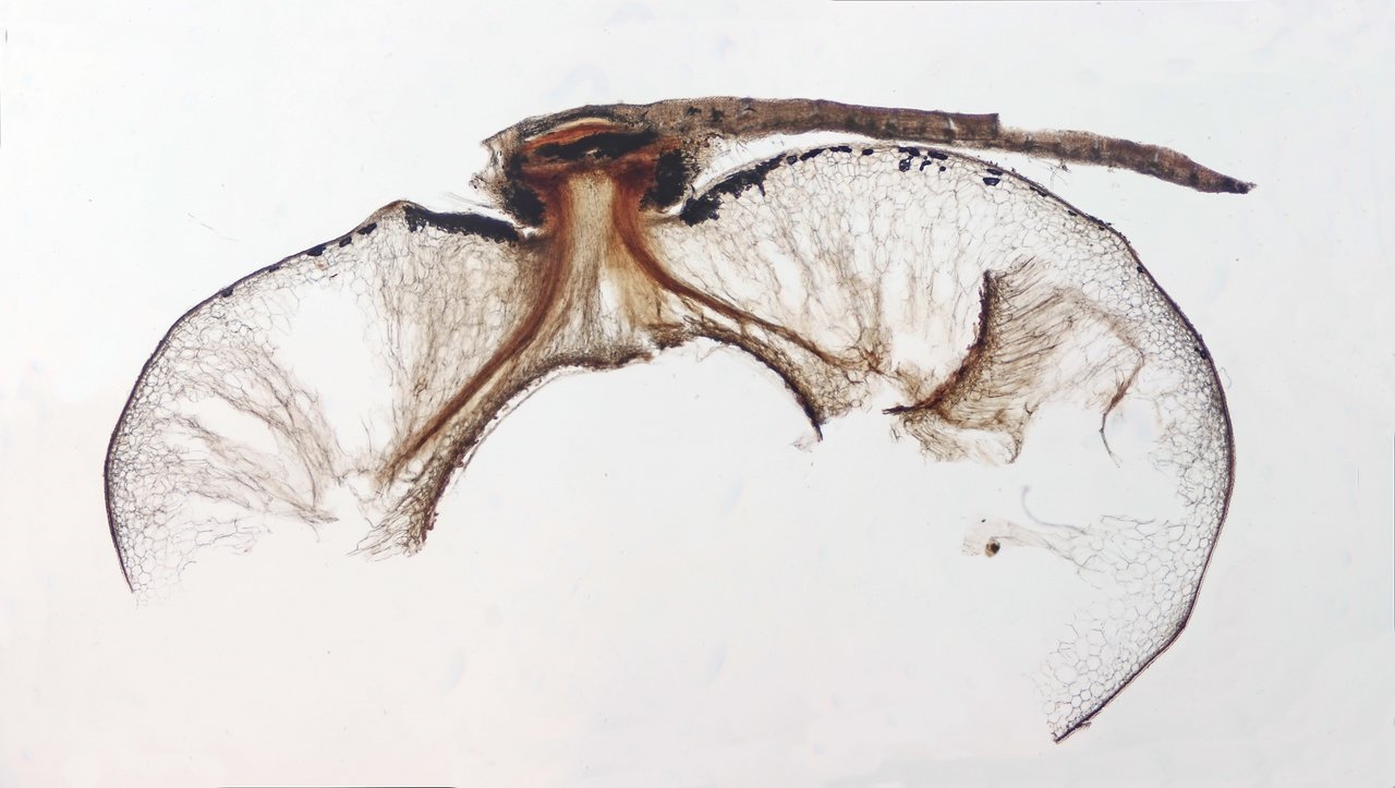 Bild 3: ungefärbter Querschnitt durch Galle. Am oberen Rand des Bildes ist ein Teil des Blattes zu sehen. Der braune Strang, der vom Blatt in die Galle zieht und sich dann in 2 Schenkel aufteilt enthält einige Tracheen. Leider ist es mir nicht gelungen, diese Strukturen in den gefärbten Schnitten darzustellen.