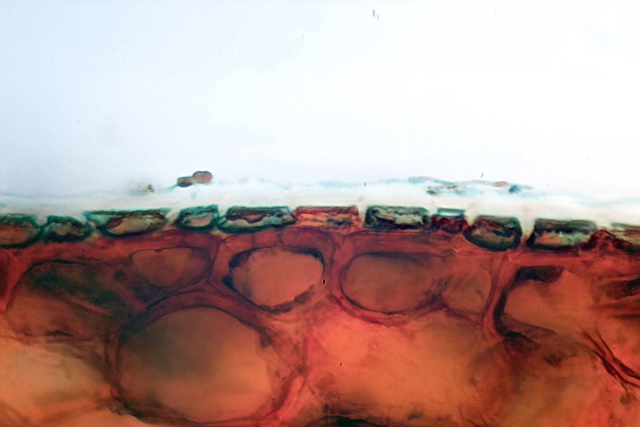 Bild 5: Die Außenwand der Galle (gefärbter Schnitt). Den flachen Epidermiszellen liegt eine Schicht auf, die bei der makroskopischen Betrachtung wie eine wachsartige Oberfläche imponiert
