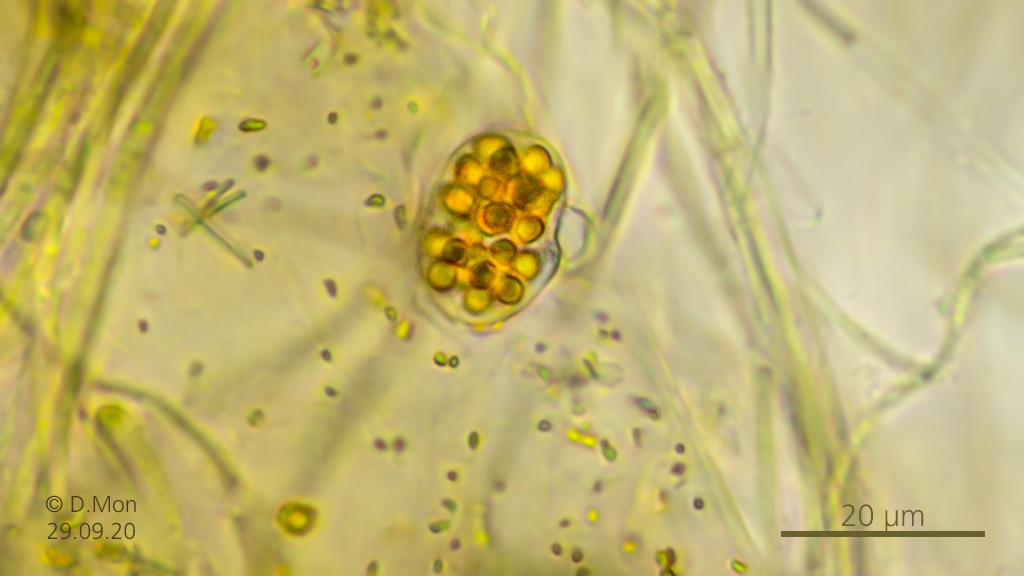 ich habe in einer Probe aus etwas Detritus Strukturen mit goldgelben Kügelchen entdeckt.