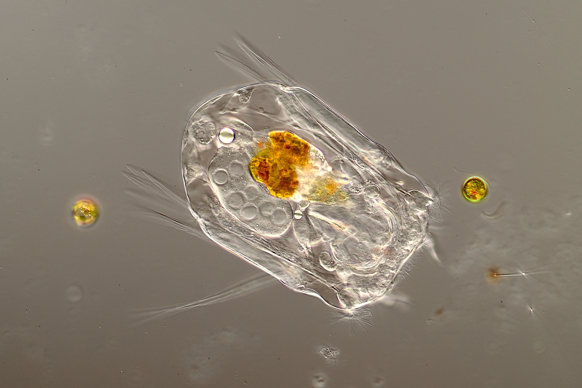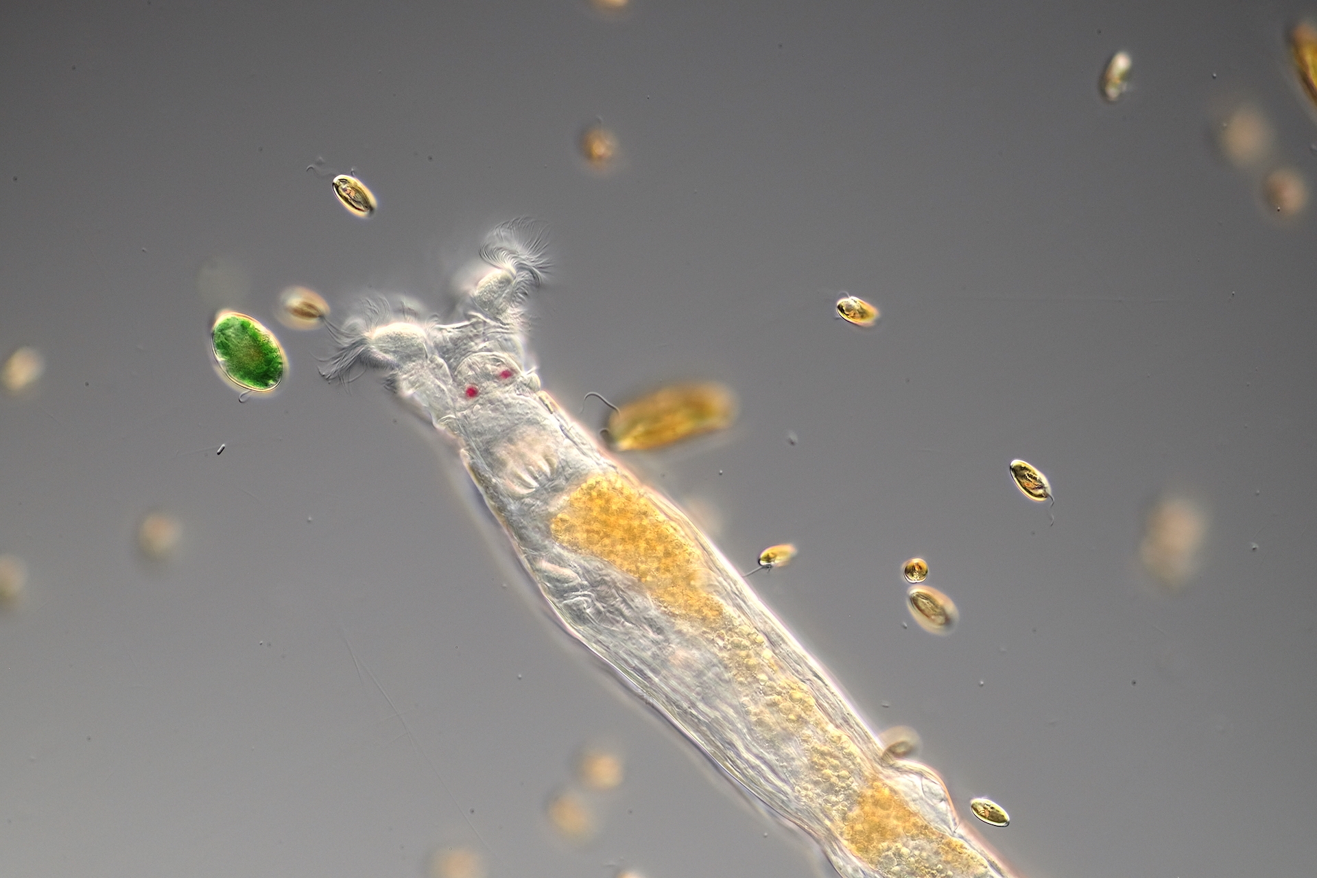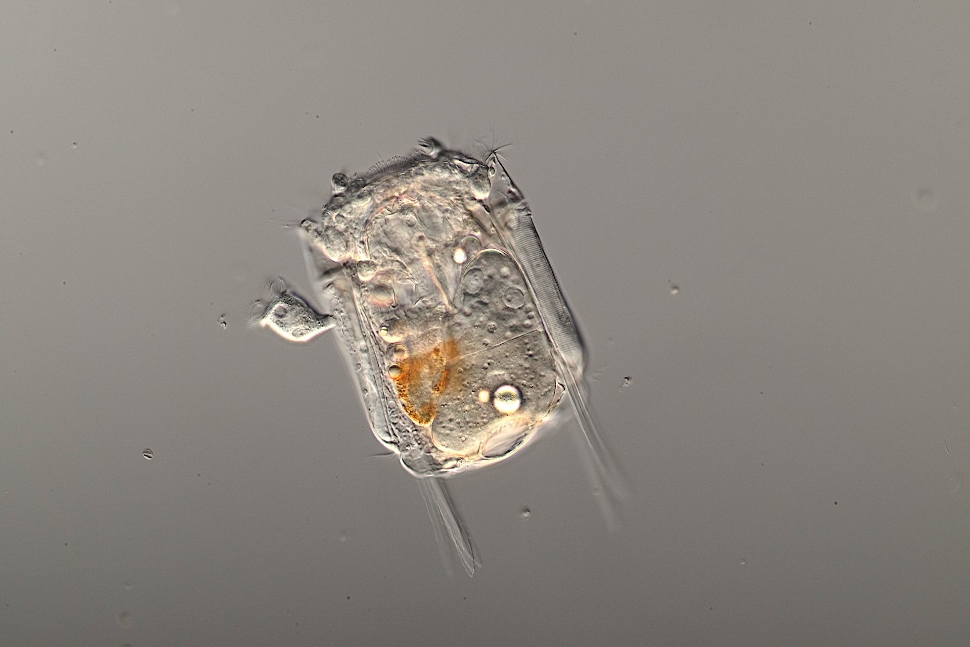 Hier das Rädertierchen mit gierigem Blick auf Nahrungssuche.....