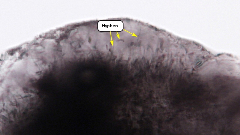 Die Pilze besitzen einen Hut mit einer etwa 100 µm dicken Schleimschicht, in der die hyphigen und zelligen Elemente nur zu erahnen sind: