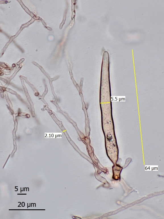 Nun habe ich ein winziges Fragment davon als Quetschpräparat aufbereitet und mit SDS-Kongorot eingefärbt: einwandfrei! Man erkennt problemlos die Huthautelemente: Es sind bäumchenartig verzweigte, dünnwandige Hyphen (Bildmitte) sowie dickwandige Zystiden (rechts daneben). An vielen Hyphensepten befinden sich Schnallen: