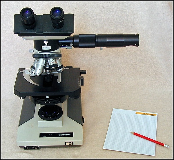 Am OLYMPUS BH2 wird der Zeichentubus zwischen Objektive und Binokular angebracht. Am rechten Ende hat der Tubus eine Öffnung. Darunter wird das Zeichenpapier und der Bleistift gelegt.