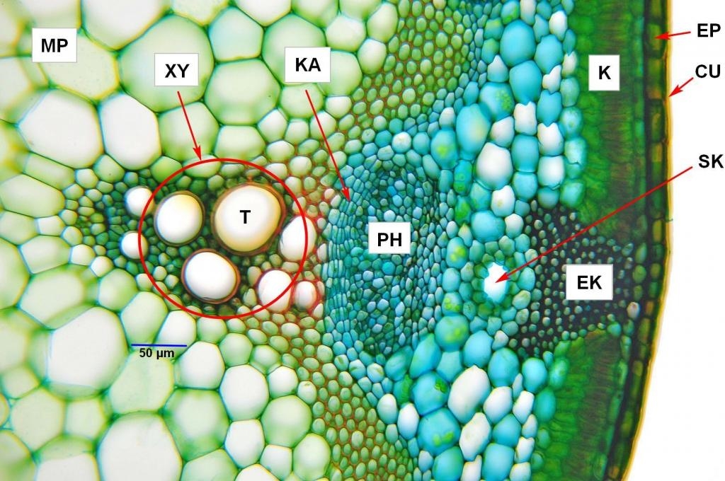 MP = Markparenchym, XY = Xylem, T = Trachee, KA = Kambium, PH = Phloem, K = Kollenchym, EK = Eckenkollenchym, EP = Epidermis, CU = Cuticula, SK = Sekterkanal