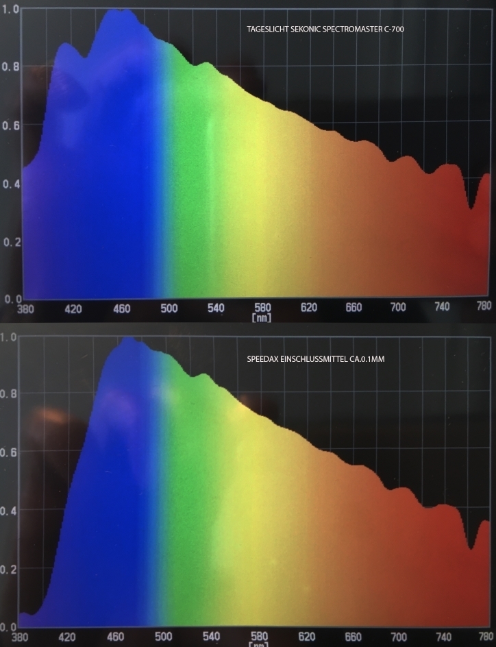 Ich glaube, bei den Kurven in Annes Beitrag wurde das Spektrum der Lichtquelle nicht abgezogen. D.h. die Transmissionskurve der Probe ist überlagert mit dem Tageslichtspektrum. Ein richtiges UV-VIS-Spektrometer macht die Referenzierung üblicherweise automatisch. Das Sekonic-Gerät ist ja eher für die Messung des Spektrums des Umgebungslichtes gedacht, da müsste man die Referenzierung auf das Spektrum der Quelle vermutlich extra durchführen.