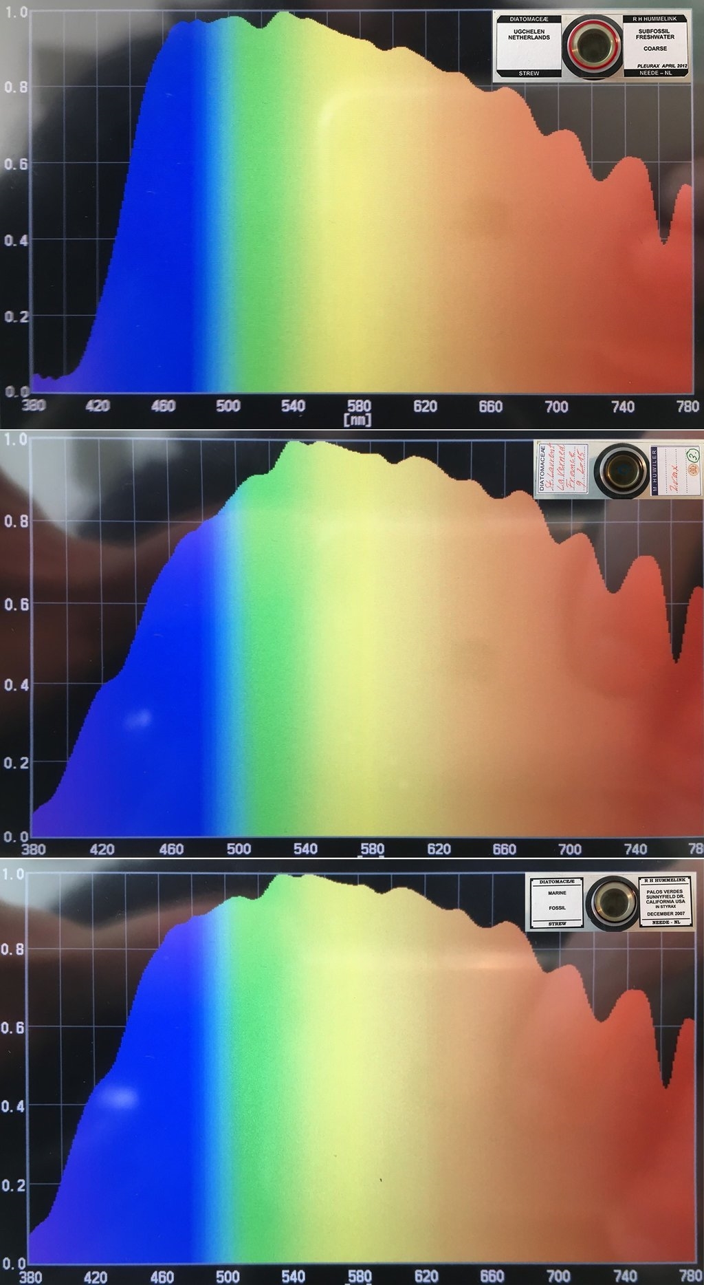 Eine Quantitative Messung müsste durch das Instrument erfolgen und auch die Quanteneffizienz der Kamera berücksichtigen! Auch die Optik im Lichtweg, der Kondenser, Objekträger, Einschlussmittel, Deckglas, Objektiv, Filter, Kamera sind nichts anderes als eine Addition von Filtern mit individueller Wirkung auf das Spektrum.