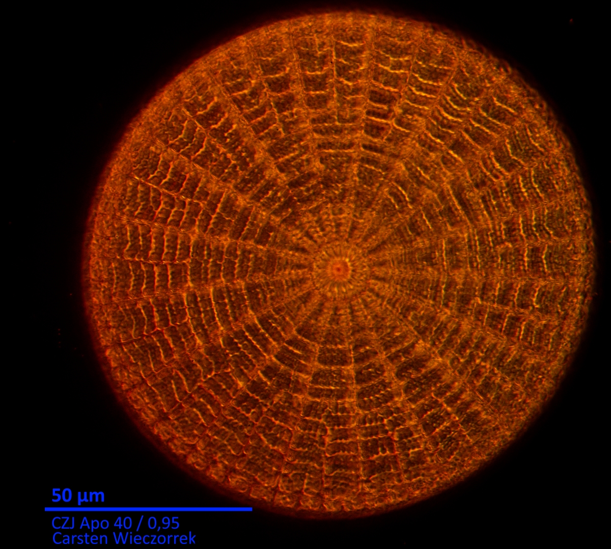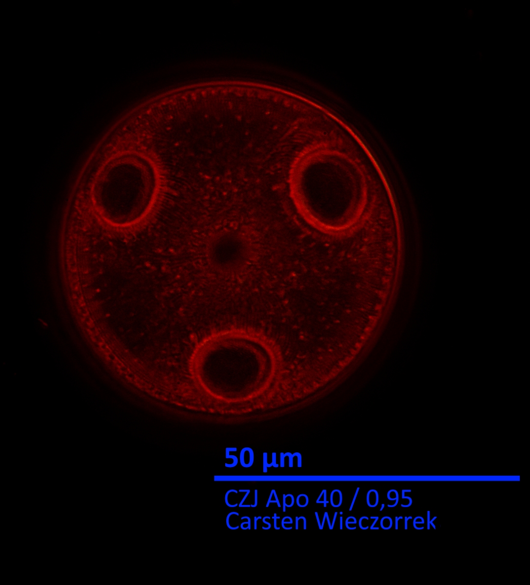 Zu sehen gibt es ein paar Diatomeen im Dunkelfeld mit vollständig gekreuztem Polarisator/Analysator. Zusätzlich habe ich mit meinem 1-Lambda-Schieber rumgespielt. Richtig "bunt" wird es aber gar nicht (wie auch bei den amorphen Schalen). Alle Bilder sind nicht gestackt.