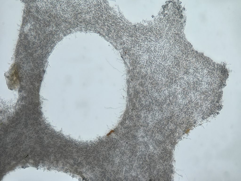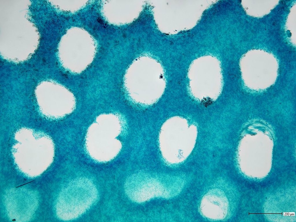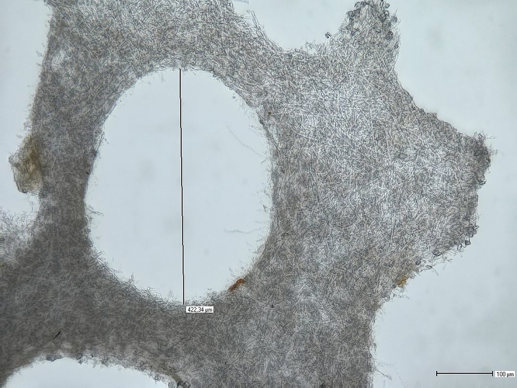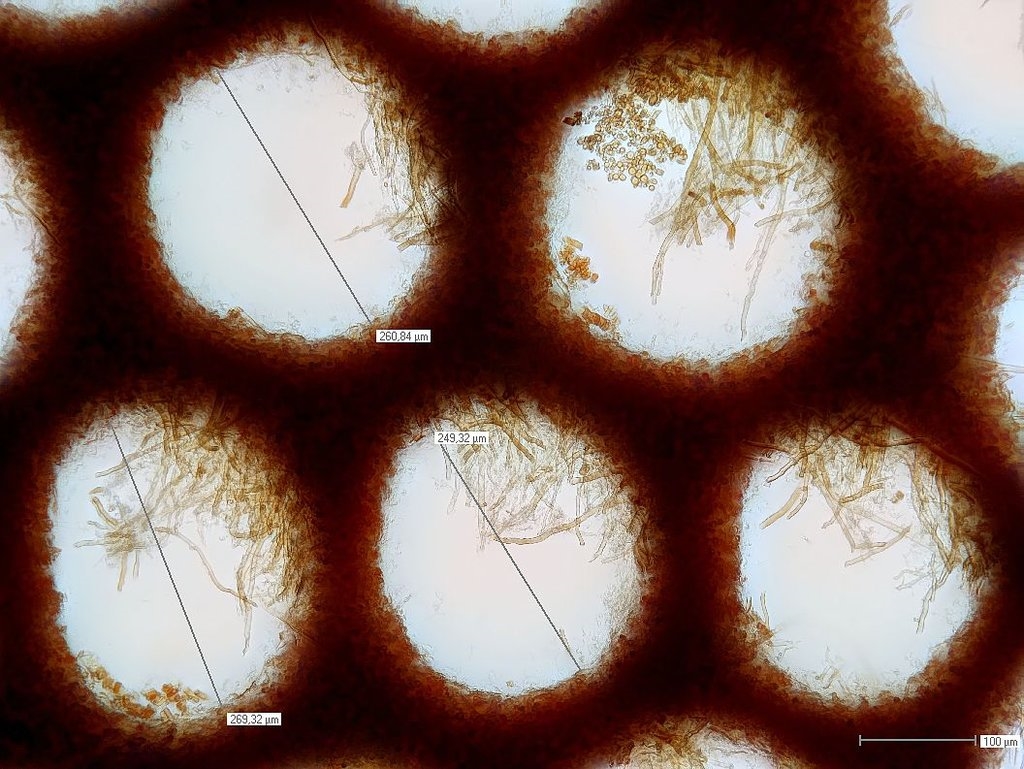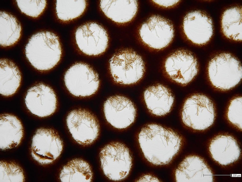 Man sieht das feine Myzel, das hier lediglich die kreisrunden Poren bildet. Eine weitere Differenzierung ist nicht erkennbar, der Durchmesser der leicht ovalen Pore beträgt an der Langseite ca. 420 µm. Einfach macht es uns der Pilz dabei nicht: eine Färbung muss her.