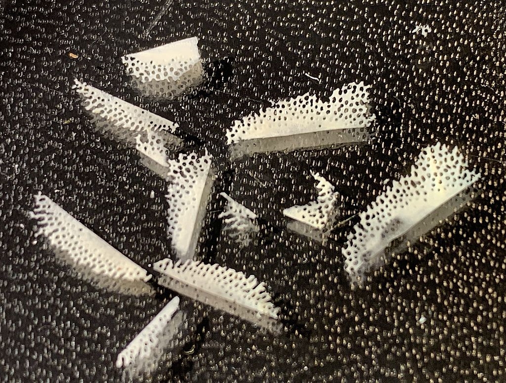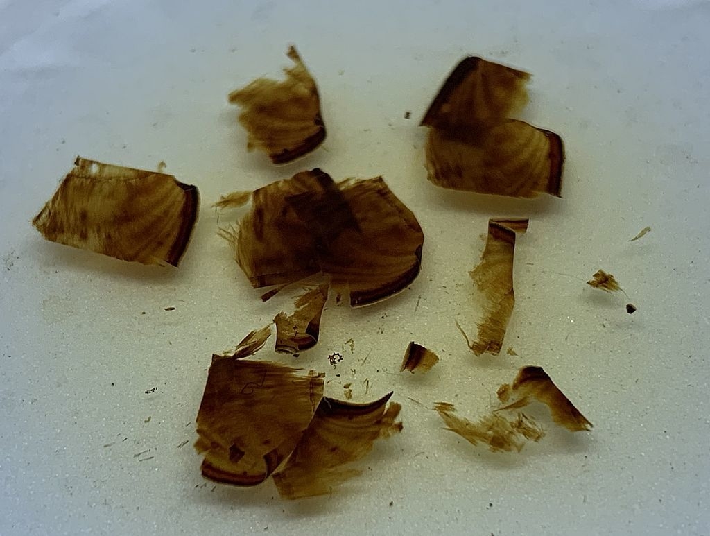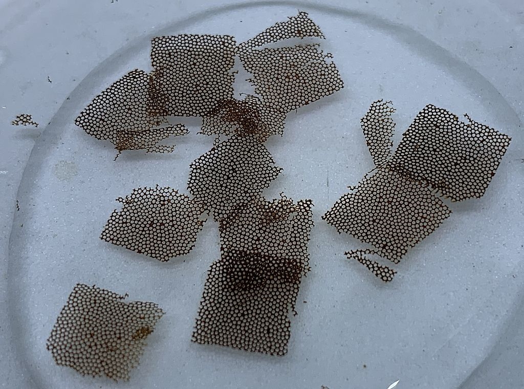 Bild 6: Die ungefärbten Schnitte im Uhrglas, der einzige dunkle Hintergrund zur Hand war mein Laborbuch mit einem genarbten Kunstledereinband.
