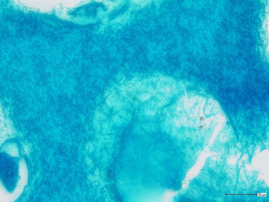Bei der Aufnahme mit dem Leica PlanApo 10x werden auch gefärbt kaum einzelne Hyphen erkennbar. Die Polaufnahme zeigt, dass beim Wachstum des Fruchtkörpers an den Wänden der Poren feiner mineralischer Staub eingebaut wurde.