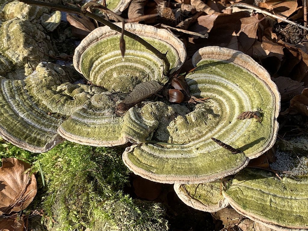 Zitat von: WikipediaWie andere baumbewohnende Pilzarten zeigt auch der Zunderschwamm den Geotropismus, das heißt, neu zuwachsende Fruchtschichten werden mit der Unterseite zum Erdboden ausgerichtet. Bildet ein Fruchtkörper nach dem Umstürzen des Wirtsbaumes neue Fruchtschichten, werden diese um etwa 90° gegenüber den schon vorhandenen ausgebildet.
