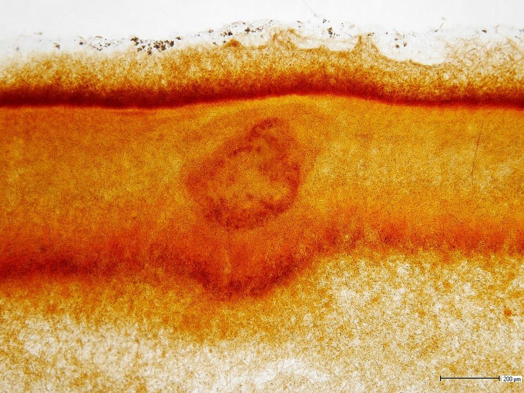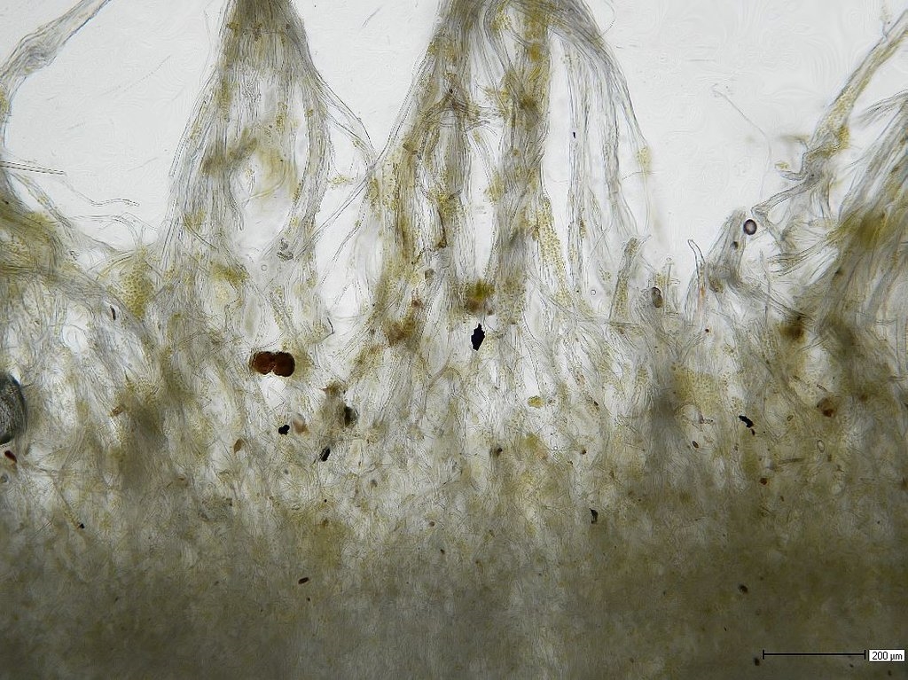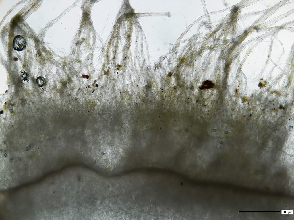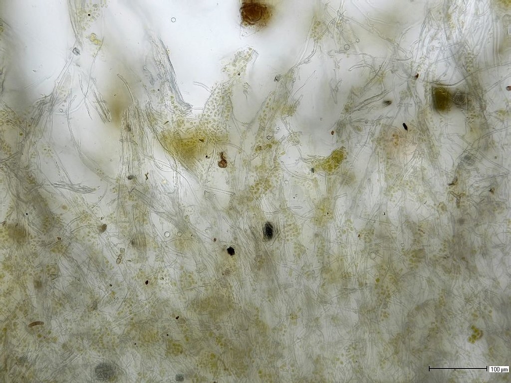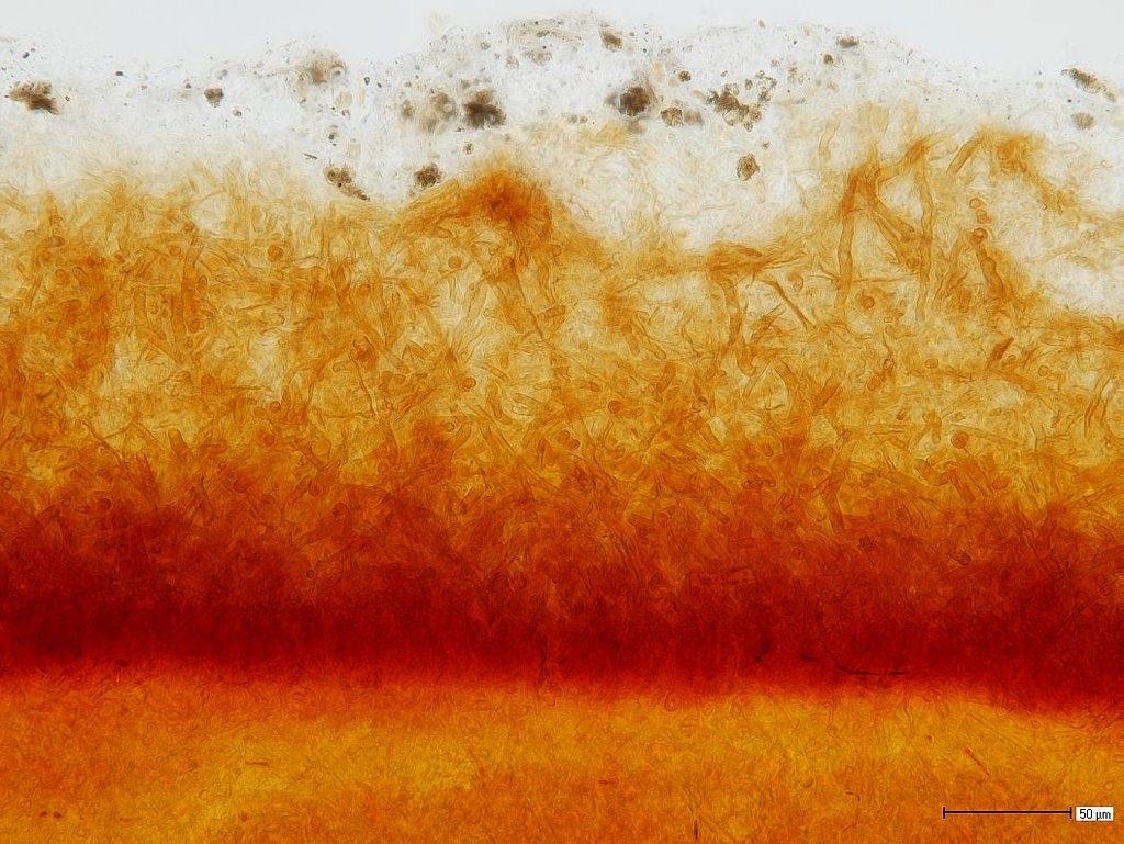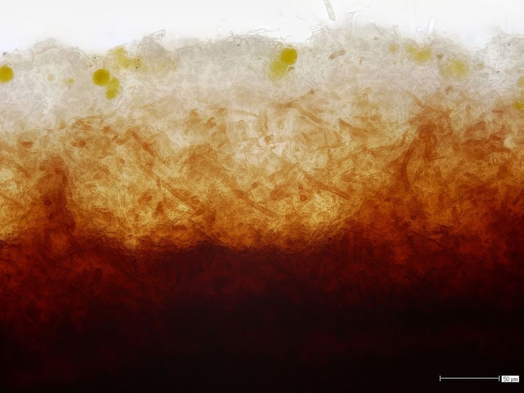 Wir sehen von oben nach unten eine ungefärbte Schicht nicht so stark verflochtener Hyphen als Begrenzung, diese ist für die weiße Farbe der Fruchtkörperoberseite  verantwortlich. Darauf folgt eine sehr stark gefärbte Schicht, gefolgt von einer dünneren, weniger stark gefärbten und wieder einer stark gefärbten Schicht. Die Auflösung in den stark gefärbten Bereichen geht gegen Null: einzelne Hyphen sind kaum auszumachen. Dies zeigt, dass nicht nur die Hyphen gefärbt sind, sondern die dunkle Farbe zu einem Stoff gehört, den die Hyphen der Kruste quasi als "Dicht- und Festigungsmasse" ausgeschieden haben.