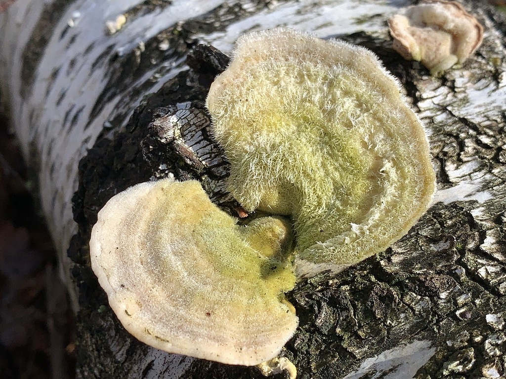 In diesem Beispiel finden sich 3 Generationen der Zunderschwamm-Fruchtkörper: Die 1. wurde gebildt, als der Birkenstamm noch aufrecht stand, die 2. nach dem Umstürzem und die dritte als der umgestürzte Stamm, der an einem steilen Hang direkt neben einem Weg lag, wohl einen Tritt bekommen und darurch nochmals verkippt wurde. Von Generation zu Generation wurden die Fruchtkörper dabei kleiner, wahrscheinlich, weil das Substrat "ausgelutscht" war. Als ich das fand, war das Holz schon so weit zersetzt, dass ich die Rinde mit den Pilzen einfach abreißen konnte.