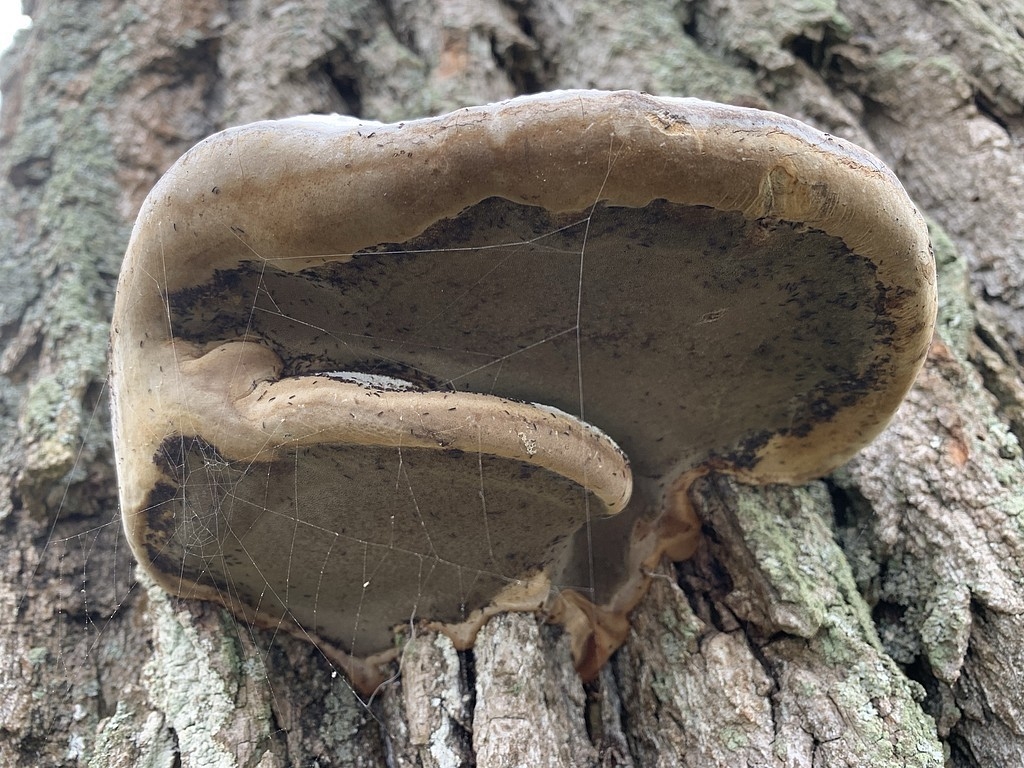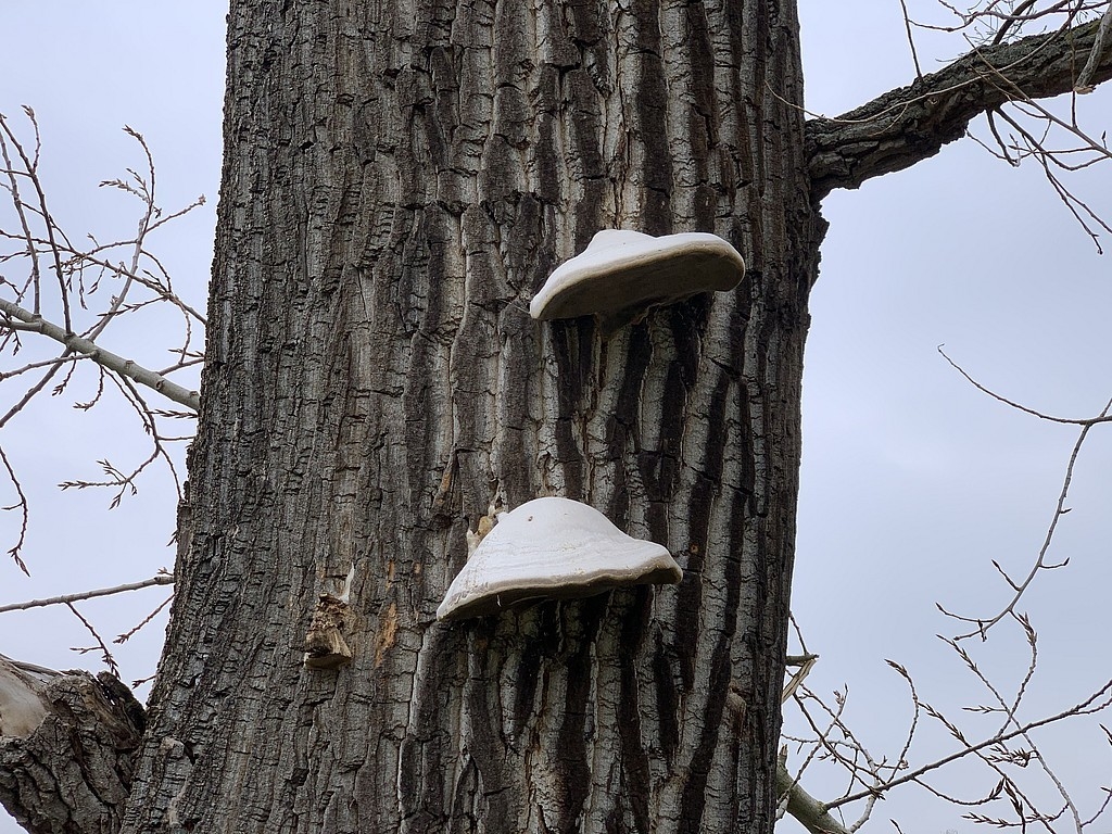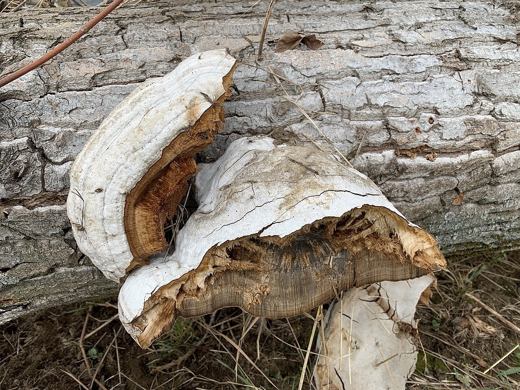 Die Bestimmung war nicht ganz einfach (Danke, Peter!), zumal die Fruchtkörper durchaus variable sind, in den Siegauen in der Regel an der Oberseite weiß erscheinen. Dies liegt sicherlich an der starken Sonneneinstrahlung an den Standorten der hauptsächlich befallenen Pappeln: sie sehr großen Bäume stehen in der Regel solitär in den Auen. Der angepflanzte Bestand ist schon recht alt und nicht mehr wirklich gesund. Da die Aue ein Naturschutzgebiet ist, lässt man den Dingen ihren Lauf und sicher nur die Wege gegen Holzbruch.