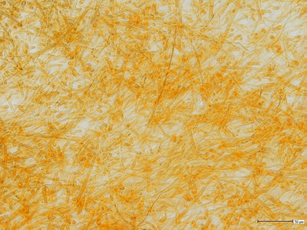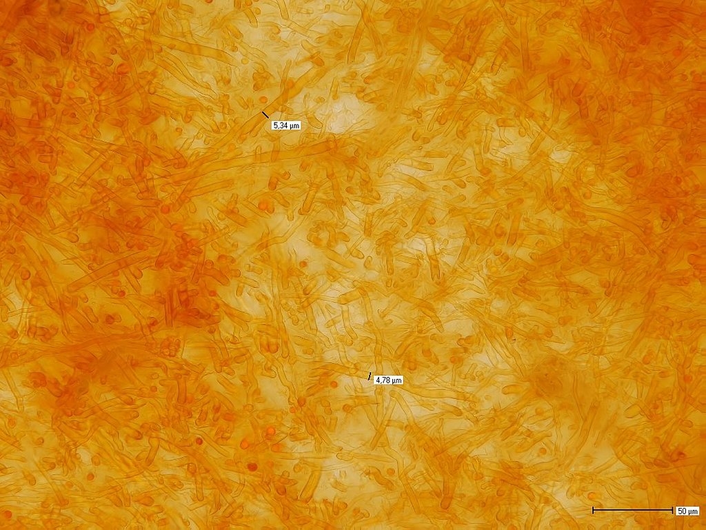 Die Hyphen des Zunderschwamms sind alle mehr oder weniger stark gelbbraun gefärbt, also habe ich die Schnitte mit Chloralhydrat für ca. 24 (Röhren) bzw. 36 Stunden (Hutoberseite) gebleicht. Entfärben konnte ich sie aber nicht, allenfalls etwas aufhellen. Eine Färbung macht hier also keinen Sinn.