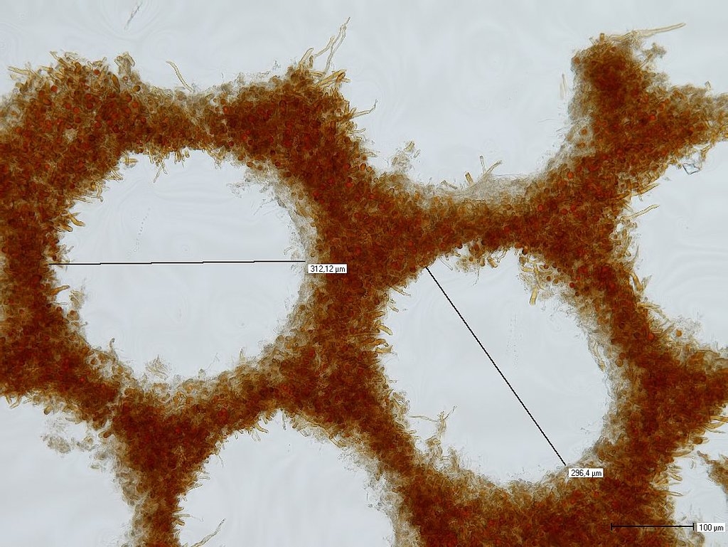 Die Röhren hier sind mit um die 300 µm etwas größer. Natürliche Schwankung oder haben sich die Hyphen bei der Bleiche im Chloralhydrat geweitet?