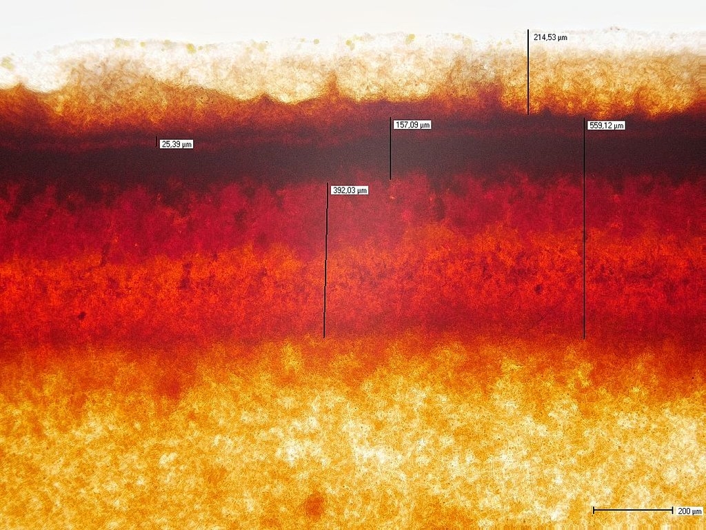 Die Kruste ist bei einer Dicke von ca. 600 µm besonders im oberen Teil sehr kompakt. Eine sinnvolle Abbildung (außer zum Messen :) ) ist eigentlich nicht möglich. Erst durch das Bleichen werden zumindest einige Details sichtbar.
