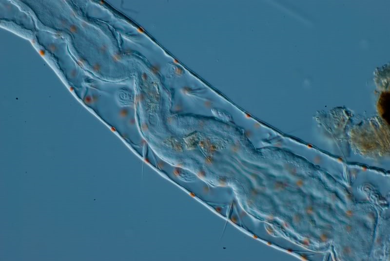 hier ist Aeolosoma variegatum, ein echter Öltröpfchenwurm, netterweise auch mit Parasiten befallen. Diesmal erschienen mir die Parasiten aber zu den Rädertieren zu gehören.