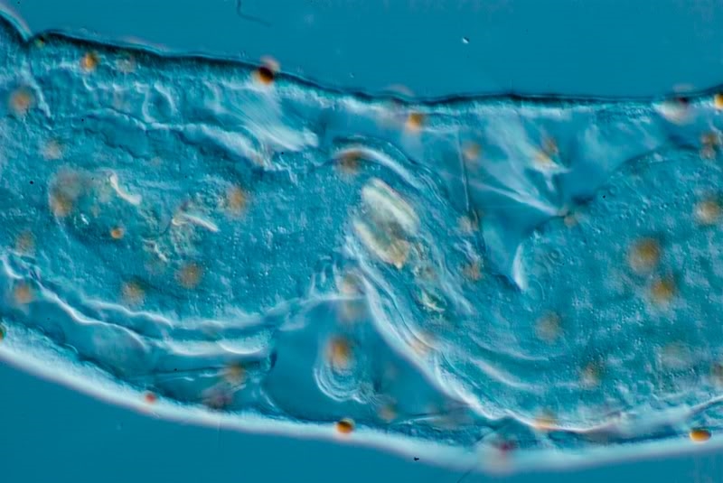die herausvergrößerte Struktur hatte ich vermutet. Aus dem 1. eingestellten Bild ist  zu entnehmen, dass die fragliche Struktur in jedem Segment des Wurms vorkommt. Im mittleren Segment und dem links oberhalb davon liegenden Segment ist sogar ein Paar dieser Strukturen erkennbar. Aus dem Lehrbuch dr Tierphysiologie (FLOREY) entnehme ich, dass die paarweise in jedem Segment vorkommenden Nephridien einen Wimpertrichter aufweisen. Ich vermute, dass es sich um ein solches im vorliegenden Bild handelt. Ich hatte in meinem Beitrag zu Stylaria ebenfalls angefragt. http://www.mikroskopie-forum.de/index.php?topic=316.0.Leider hat sich bisher kein Wurm-Experte dazu geäußert ...