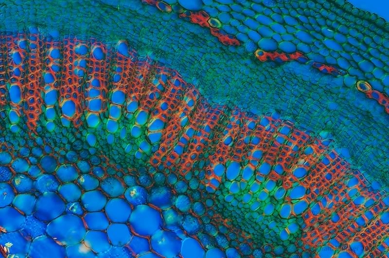Interessant finde ich die farbliche Rot-Differenzierung des dünnen Skerenchymrings, das schon ins leicht violette geht, zum "normal-Rot" des Xylems.