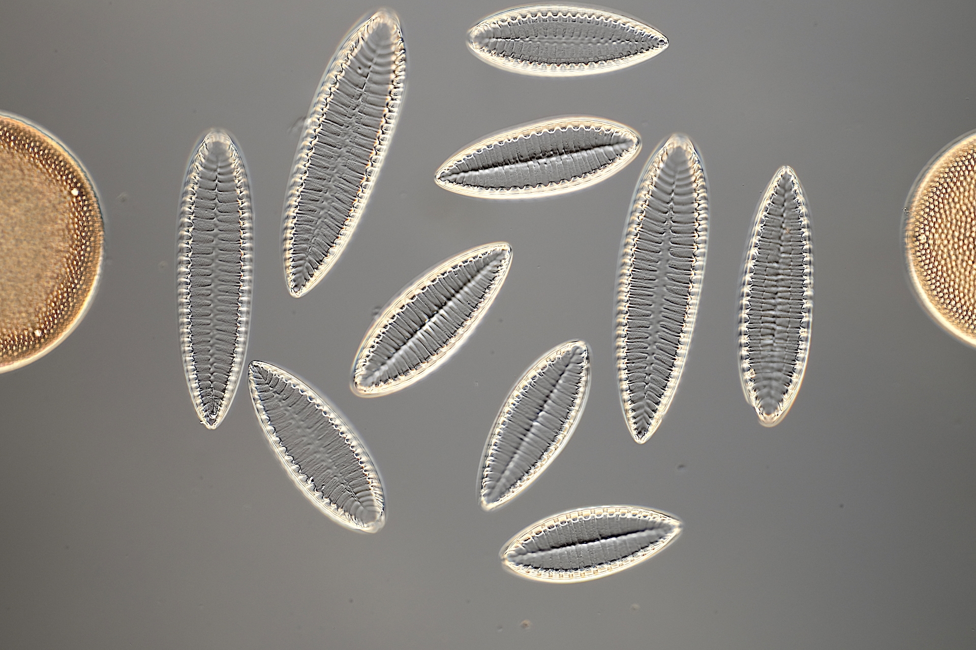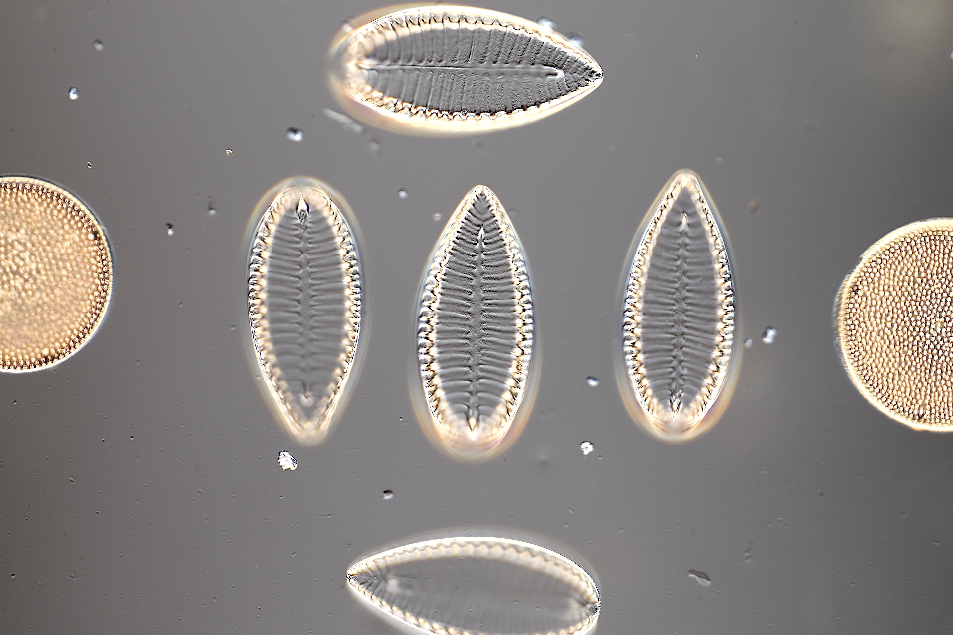 Surirellen gehören zu den Diatomeen mit komplexeren Schalenstrukturen. Hier einige schöne Süßwasserformen im Überblick. Aufnahme "gestackt" mit Direktprojektion auf CMOS-Sensor