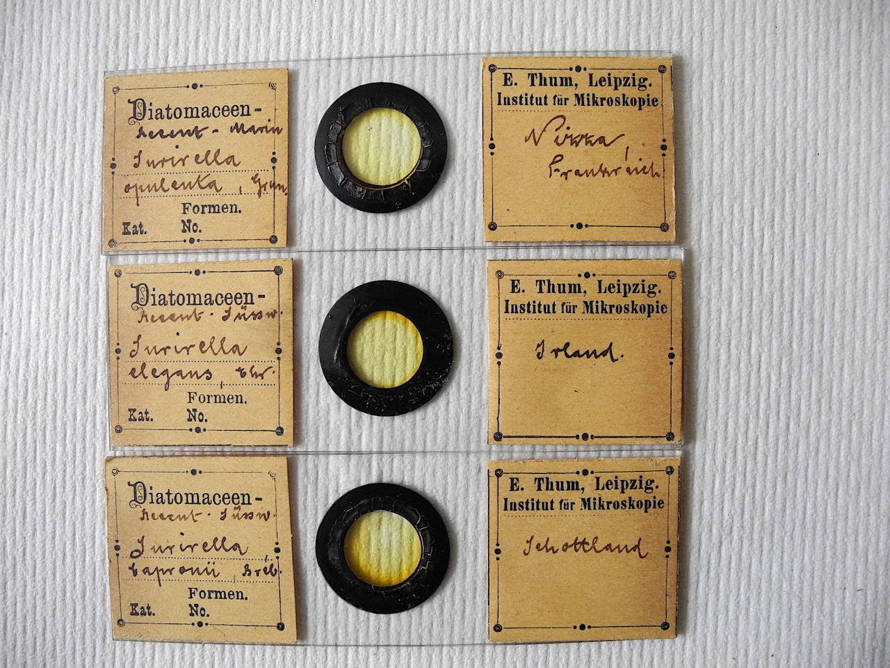 angeregt durch deinen Suriellen-Beitrag habe ich eine alte Kiste mit Präparaten hervorgeholt, denn ich wußte, da sind auch Suriellen drin. Hier sind 3 Präparate aus 3 verschiedenen Ländern, siehe Bild 1.