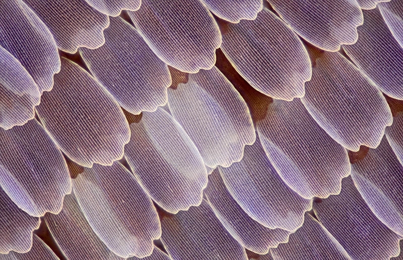 Die Flügelschuppen des Schmetterlings Chilasa paradoxa besitzen ein gut erkennbares Gittermuster, das auch bei voller Bildauflösung in den Bildecken nicht sichtbar leidet und keine störenden CA's besitzt.
