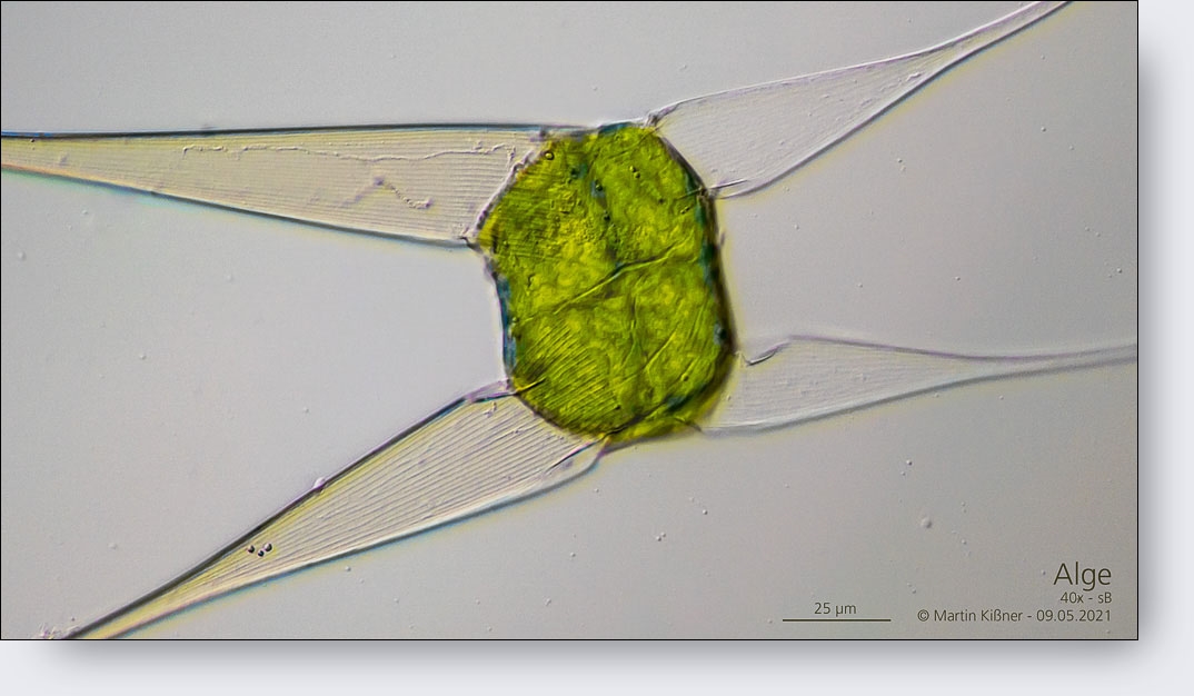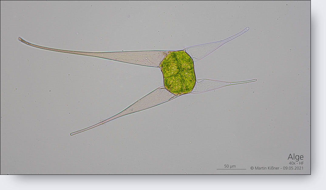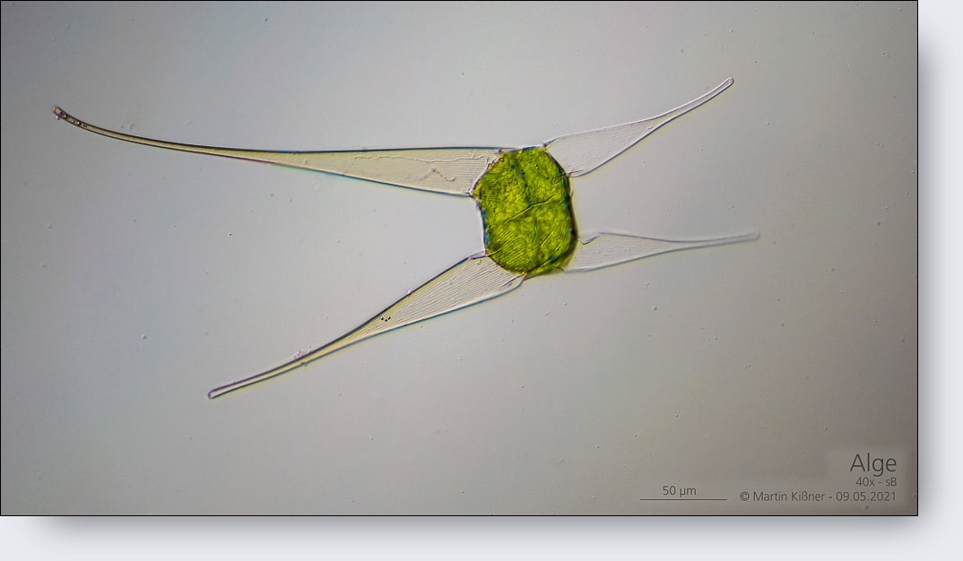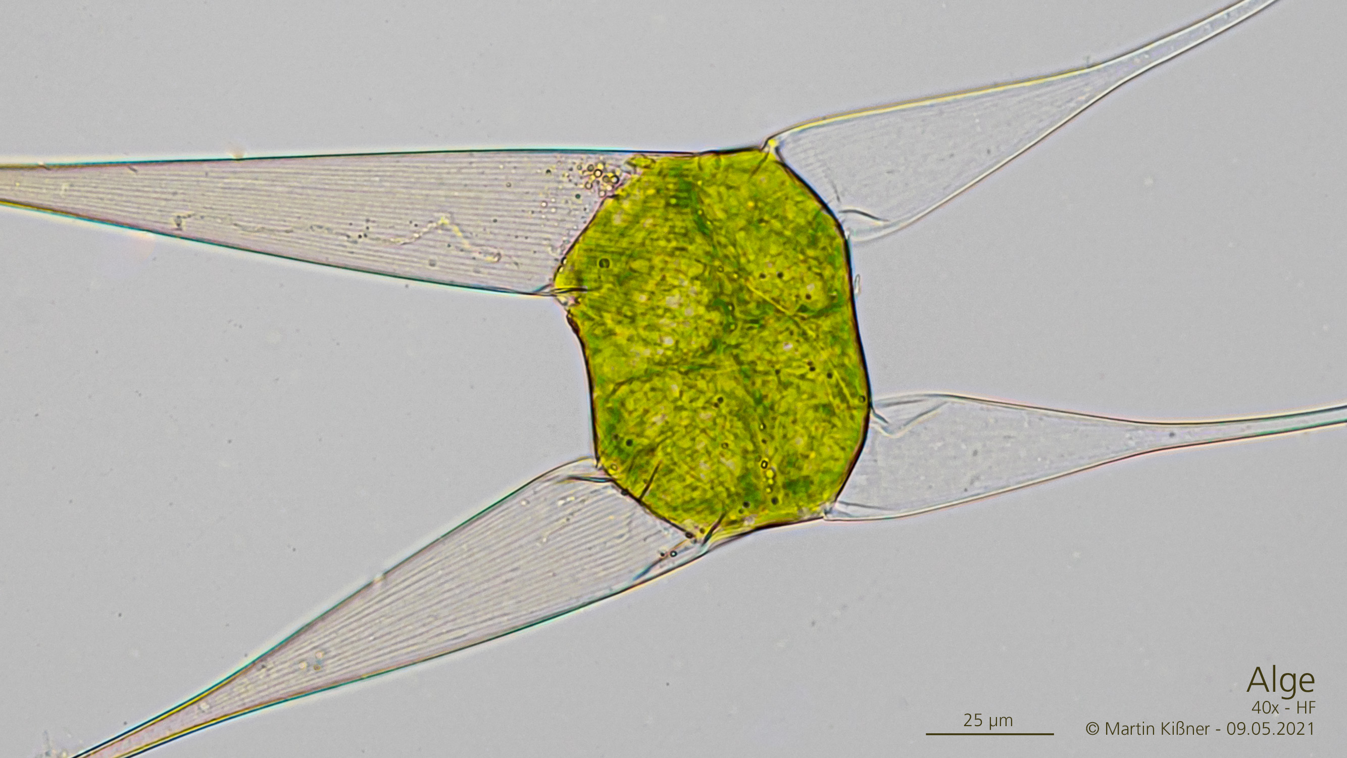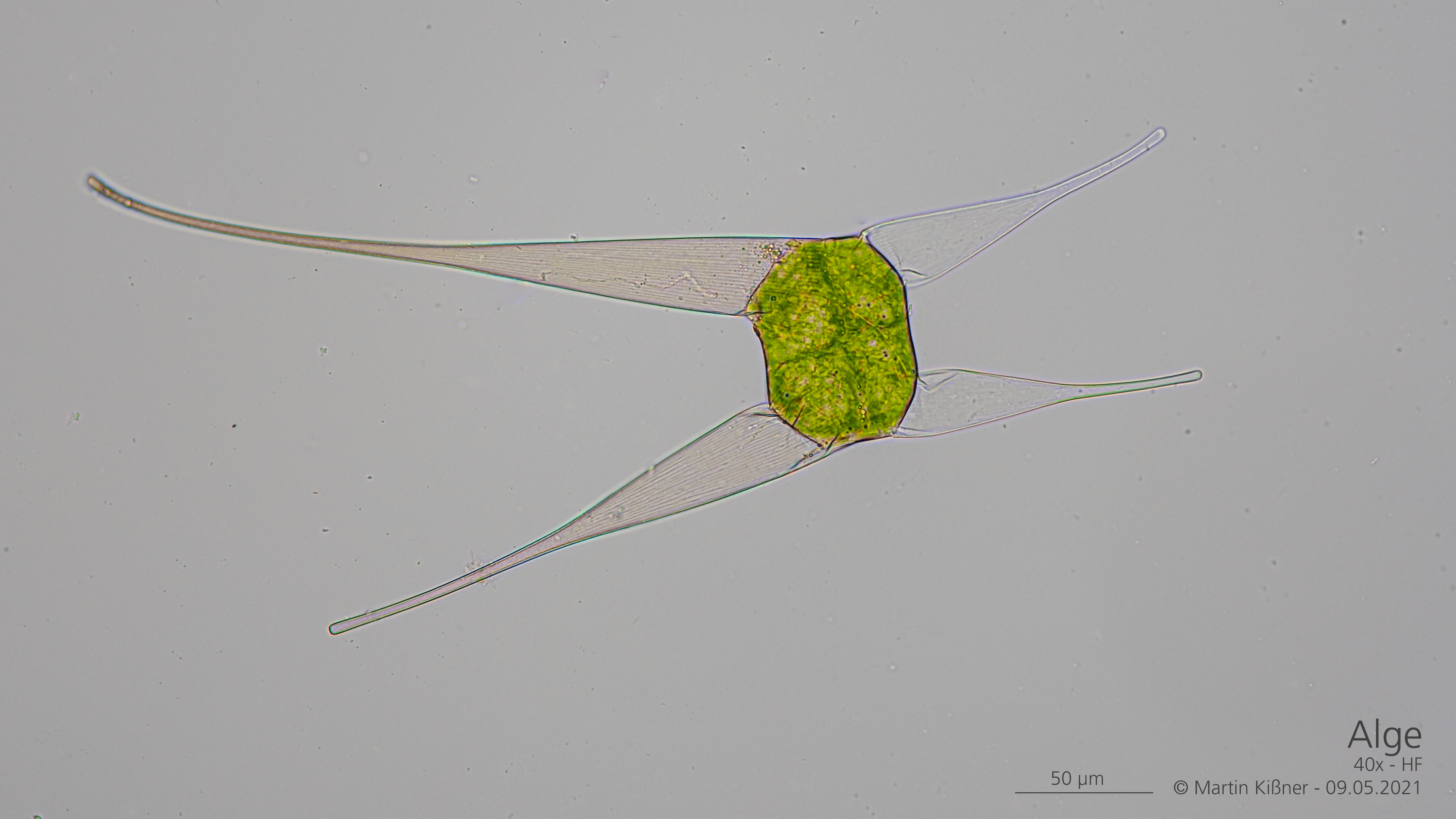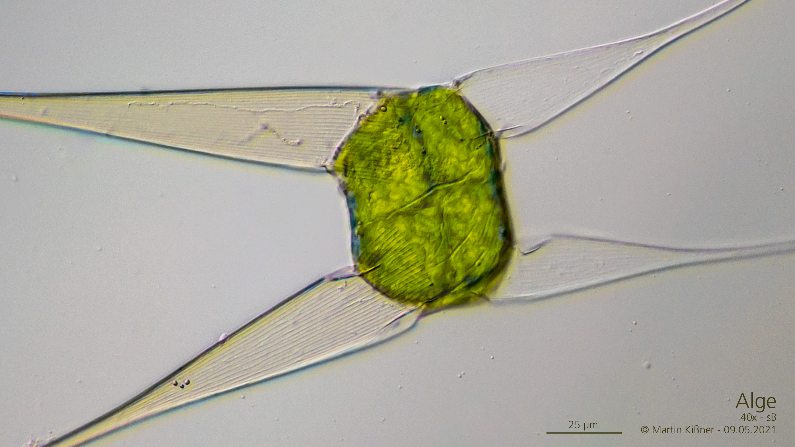 An Staurastrum (und Staurodesmus) hatte ich auch schon gedacht, war dann aber verunsichert, weil ich die ausgeprägte Zweiteilung nicht ausmachen konnte, die ich bei den Beispielen gesehen hatte.