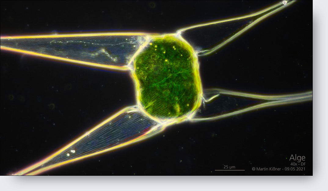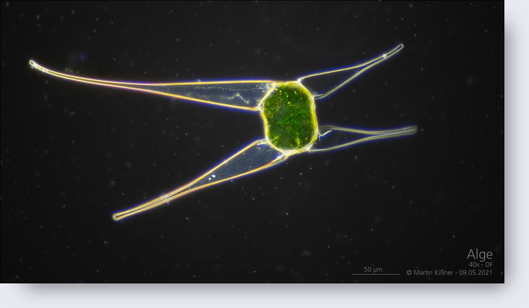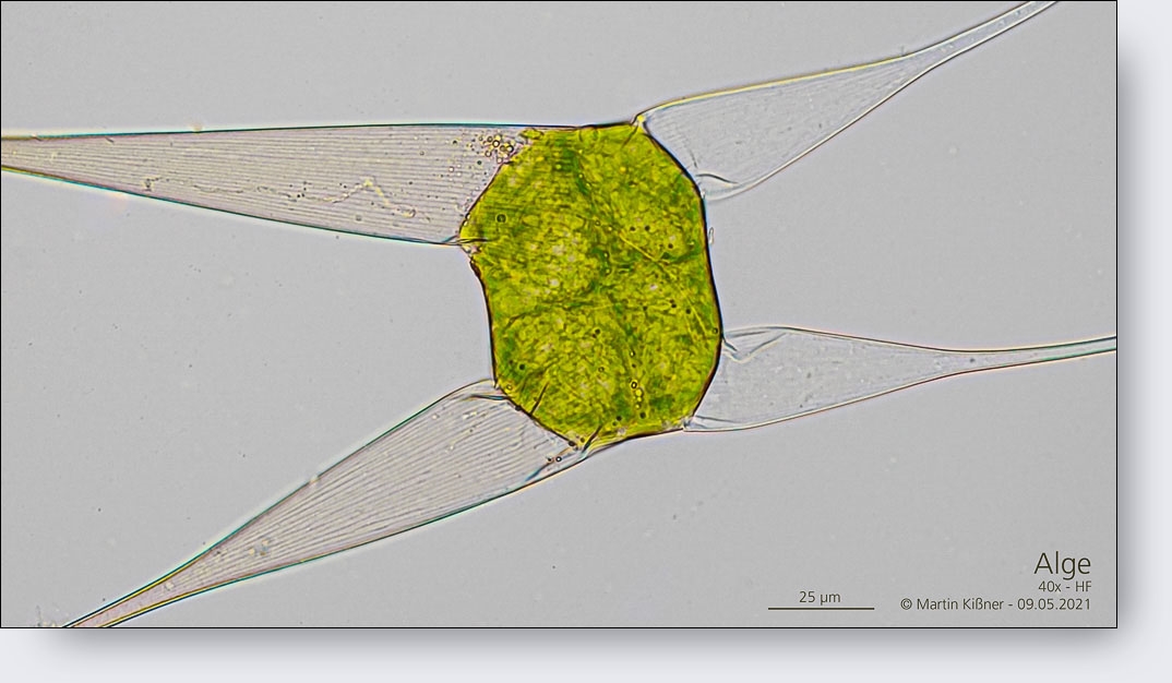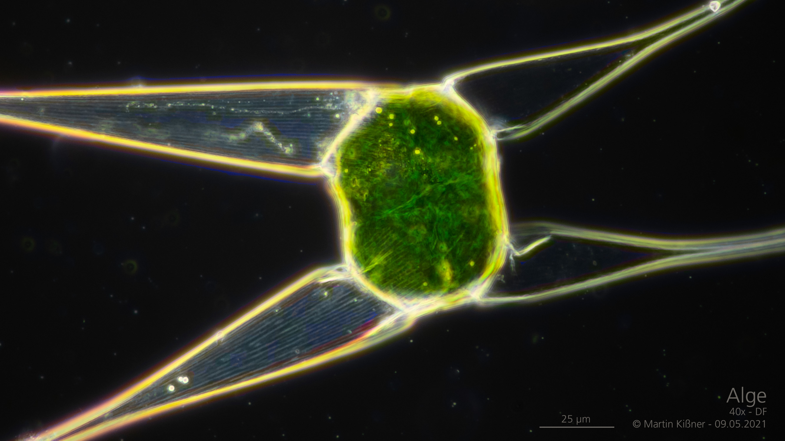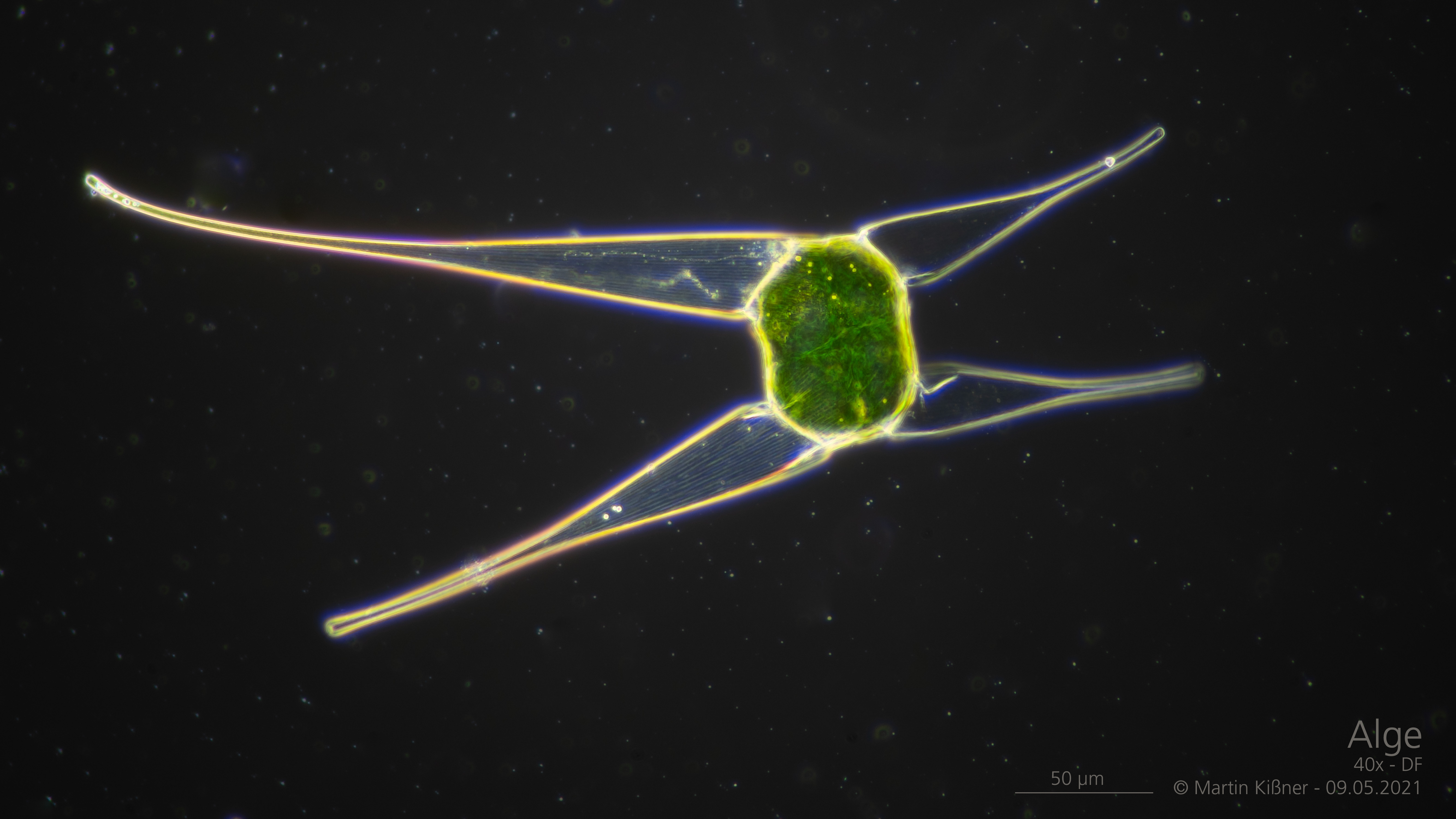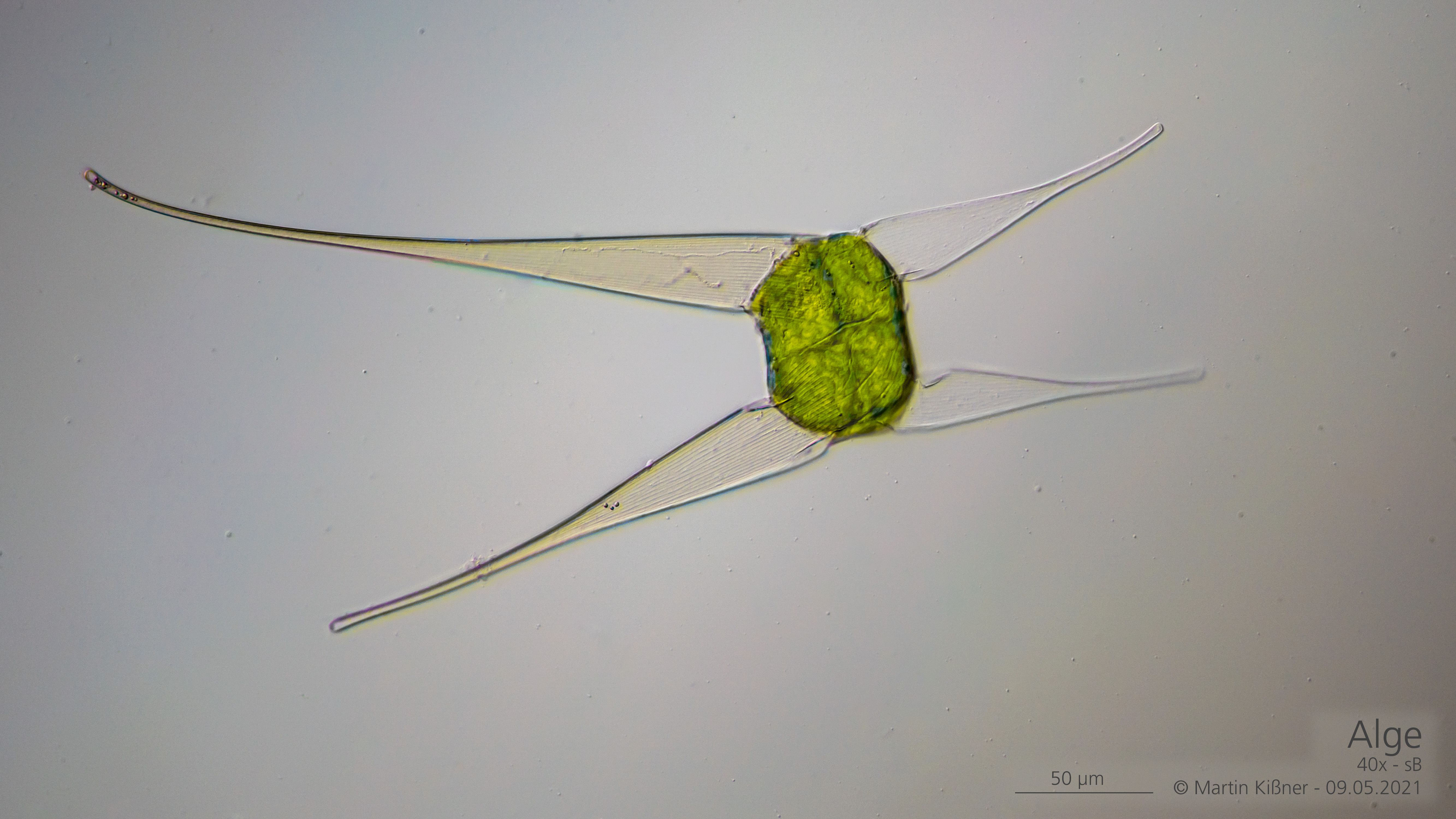 An Staurastrum (und Staurodesmus) hatte ich auch schon gedacht, war dann aber verunsichert, weil ich die ausgeprägte Zweiteilung nicht ausmachen konnte, die ich bei den Beispielen gesehen hatte.