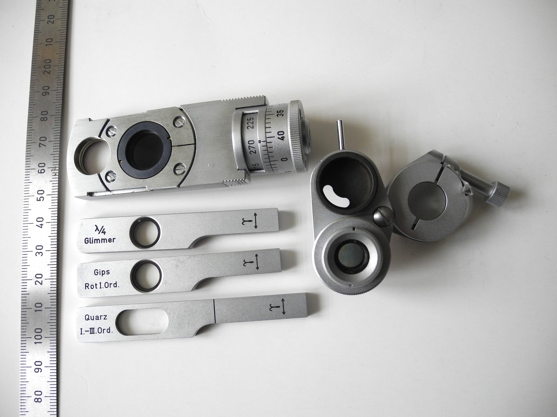 da muss ich Dich leider berichtigen. Ein Kippkompensator ist nicht dabei, sondern es handelt sich bei dem oberen Teil tatsächlich "nur" um einen drehbaren Analysator, darunter sind zwei Kompensatoren mit festem Gangunterschied und ein Quarz-Keil mit 3 Ordnungen. Sie sehen ziemlich "wertig" aus, aber zu welchem Mikroskop sie gehören weiß ich auch nicht.