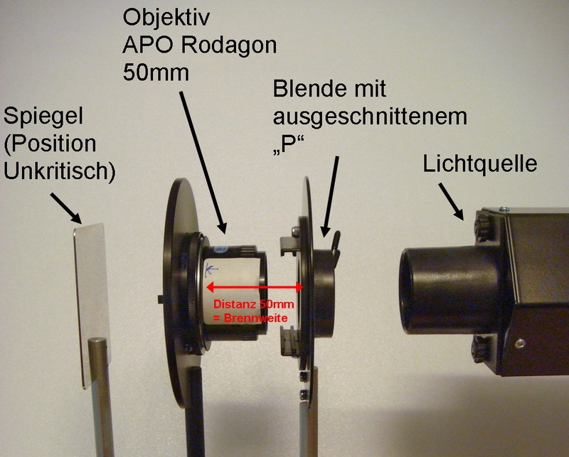 Lichtquelle, schwarze Blende mit einem ausgefrästen "P", Objektiv, Spiegel (Distanz zum Objektiv unkritisch).