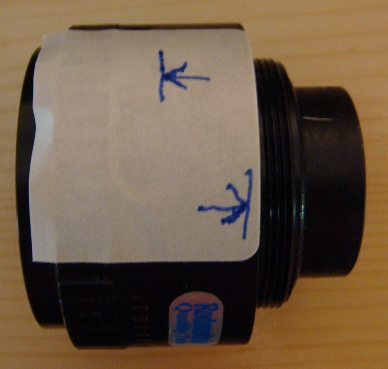 Dann wird, in diesem Falle mit einer Brennweite von 50mm, von der schwarzen Blende 50mm zum Objektiv abgemessen. Dieser Punkt befindet sich im Objektiv und zeigt die Position der einen Hauptebene, diese wird am Objektiv markiert.
