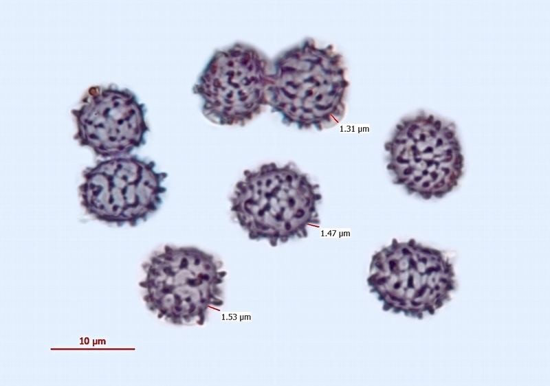 Bild 5 - Eine Collage aus acht Sporen zeigt Ornament-Messwerte von 1,44 und 1,53 µm (Warzen) sowie 1,31 µm (Grat).