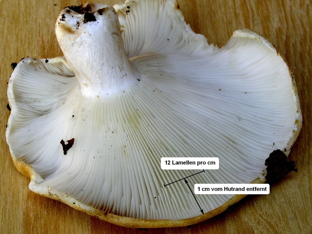 Die Anzahl der Lamellen pro lfd. cm misst man bei Weißtäublingen in 1 cm Entfernung vom Hutrand. Durch den Abstand vom Hutrand entfallen die sehr zahlreichen verkürzten Lamellen (Lamelletten). Beim Schmalblättrigen Weißtäubling misst man so 8-16 Lamellen pro cm.