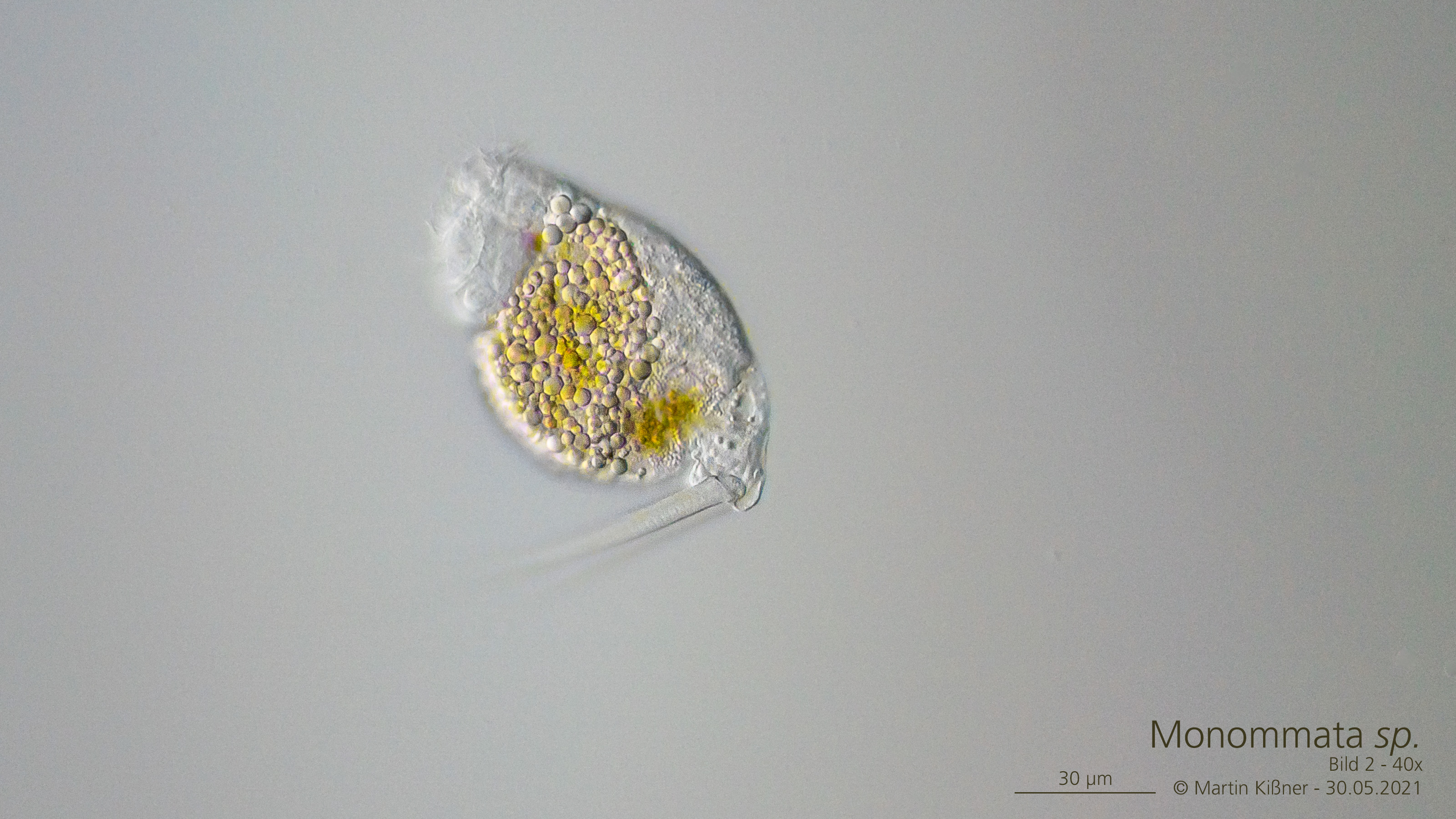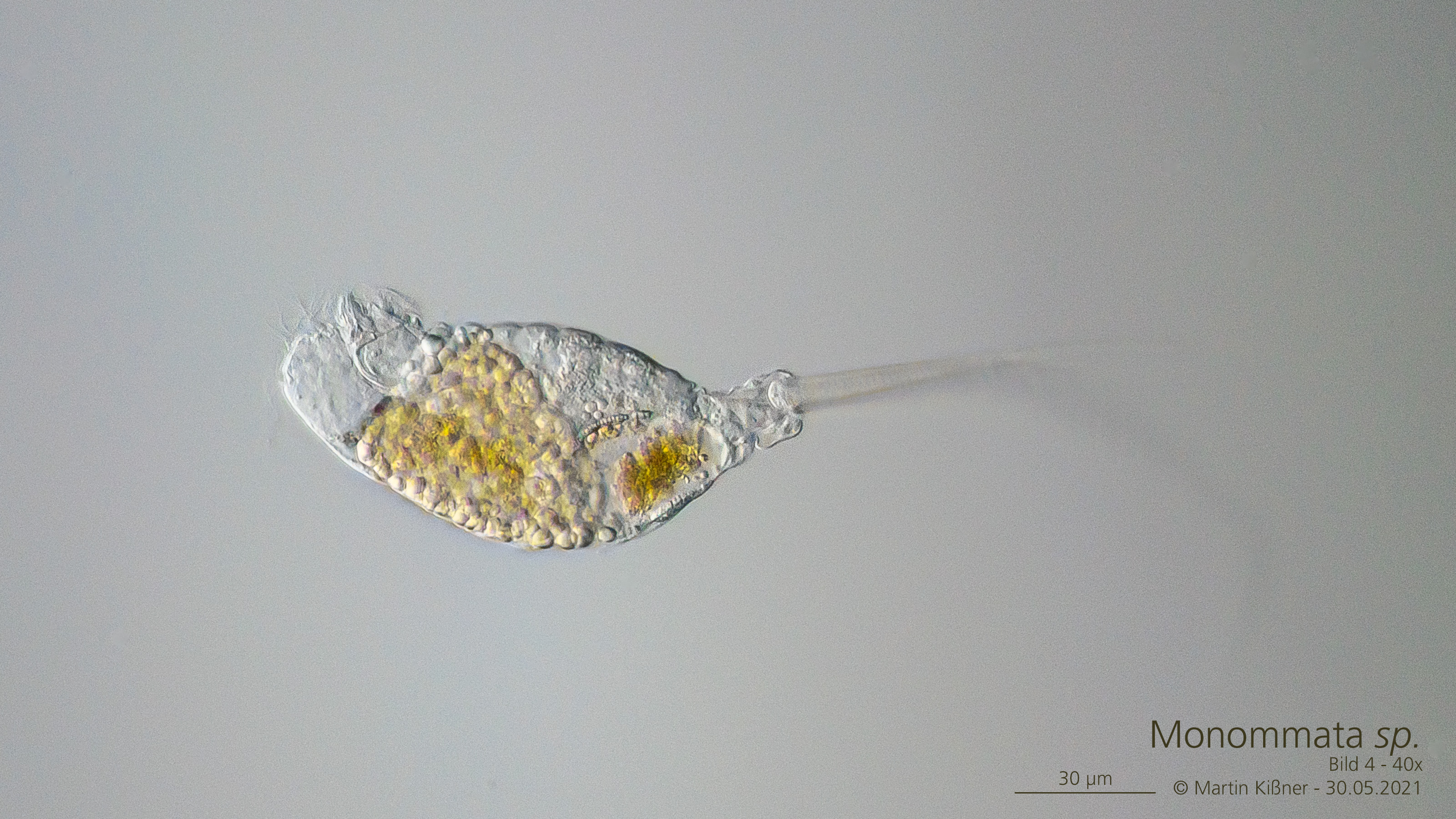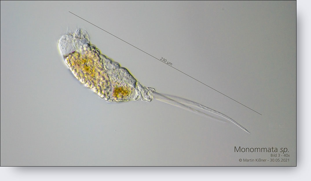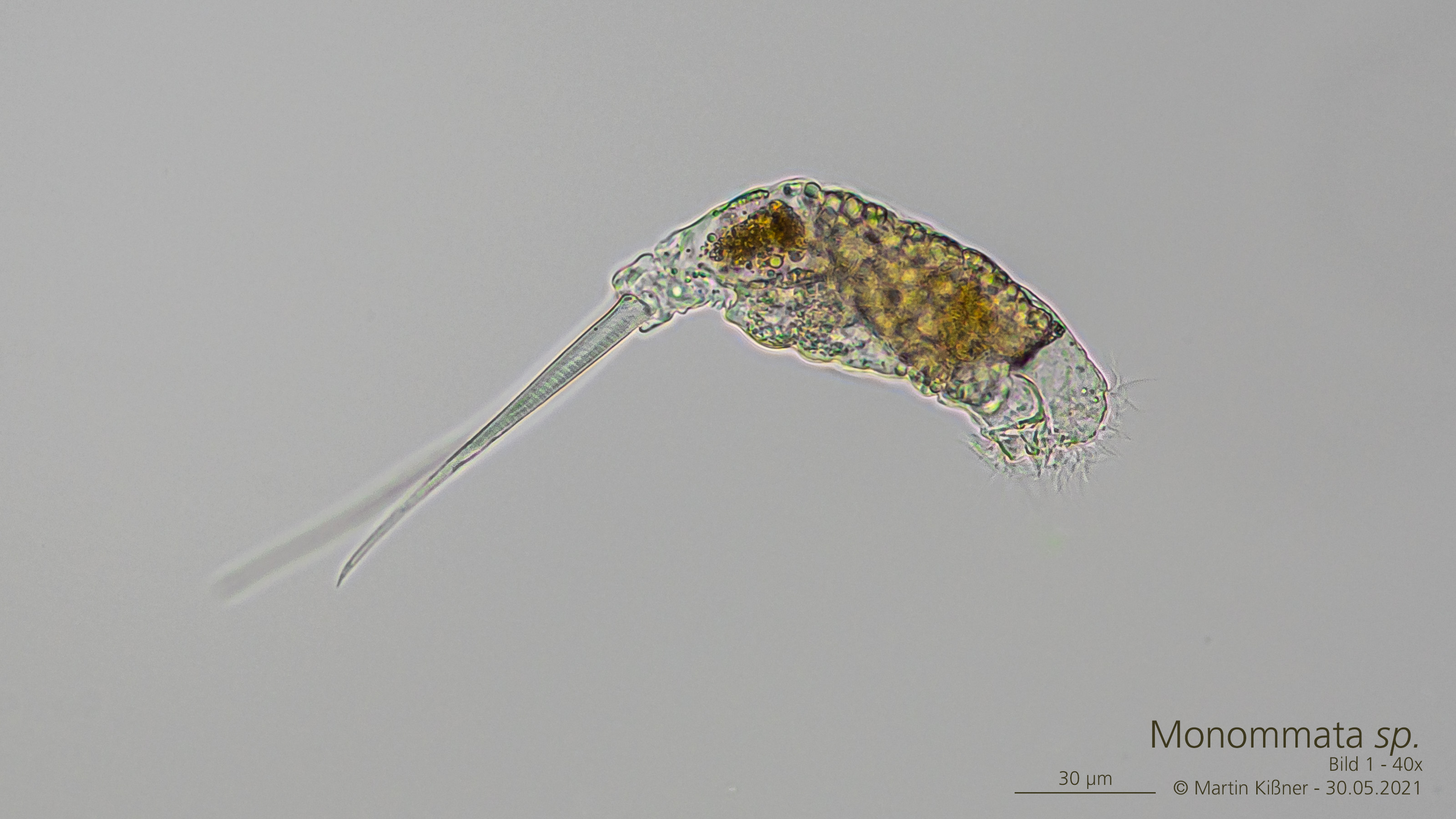 ich sehe gerade deinen Beitrag. Gerade habe ich in einer Moorwasserprobe aus dem Bayerwald die gleiche Spezies entdeckt. Nach Streble/Krauter (Leben im Wassertropfen) und Michael Plewka (https://www.plingfactory.de/Science/Atlas/KennkartenTiere/Rotifers/01RotEng/source/Monommata%20longiseta.html) ist es eindeutig M.longiseta.