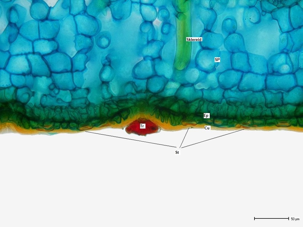 Hier reichen die Sklereiden (sklI für sklerenchymatische Idioblasten) von der Blattober- und Unterseite nur je bis knapp in die Mitte des Querschnitts und sind zusätzlich mit rhomboedrischen Calciumoxalatkristallen besetzt.