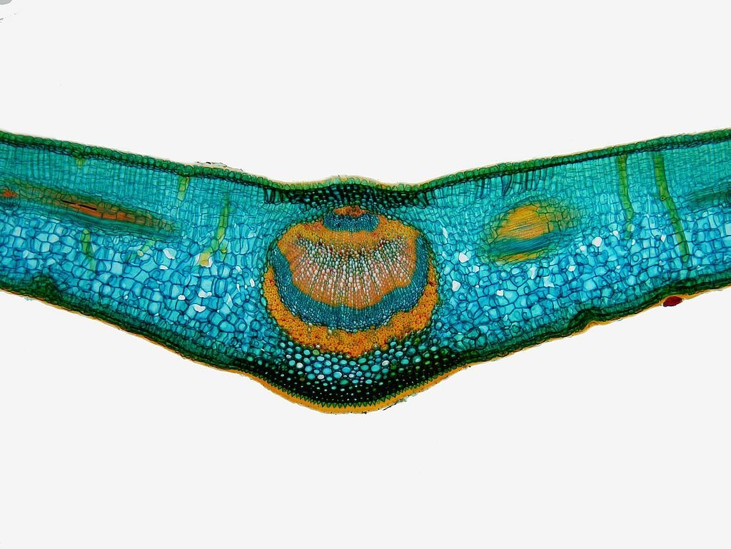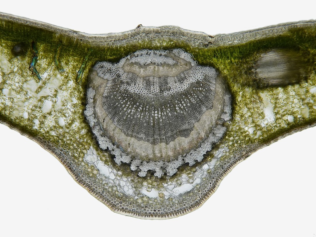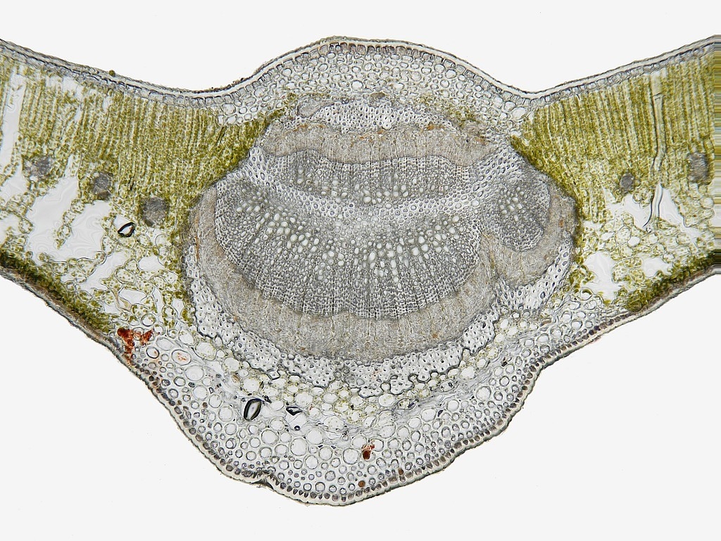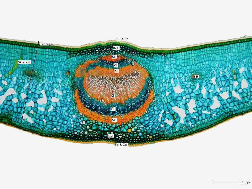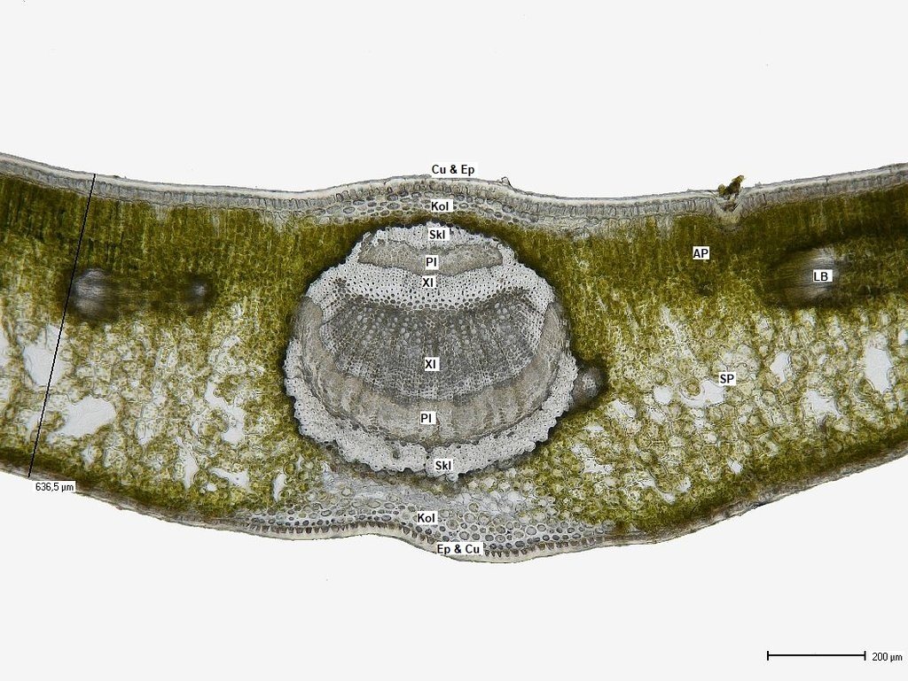 Betrachten wir zunächst die Mittelrippe: unter einer stark ausgeprägten Cuticula (Cu) folgen die Epidermis (Ep) und eine kleine Gruppe Kollenchymzellen (Kol). Das Leitbündel hat einen symmetrischen Aufbau: es besteht, von oben nach unten, aus zwei Gruppen die sandwichartig übereinander liegen: wir finden Sklerenchym (Skl), Phloem (Pl) und Xylem (Xl) und dann in umgekehrter Reihenfolge und deutlich größer Xylem, Phloem und Sklerenchym. Dabei zeigt es sich, dass am Sklerenchym oben und unten zerstörte Phloemzellen anliegen (dPl, disfunktionales Phloem). Nach unten hin folgen dann wieder Kollenchym, Epidermis und die an der Blattunterseite deutlich dünnere Cuticula.