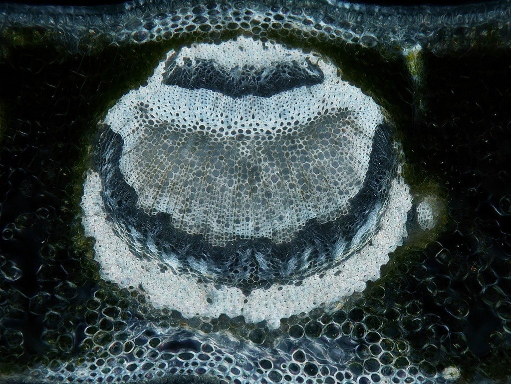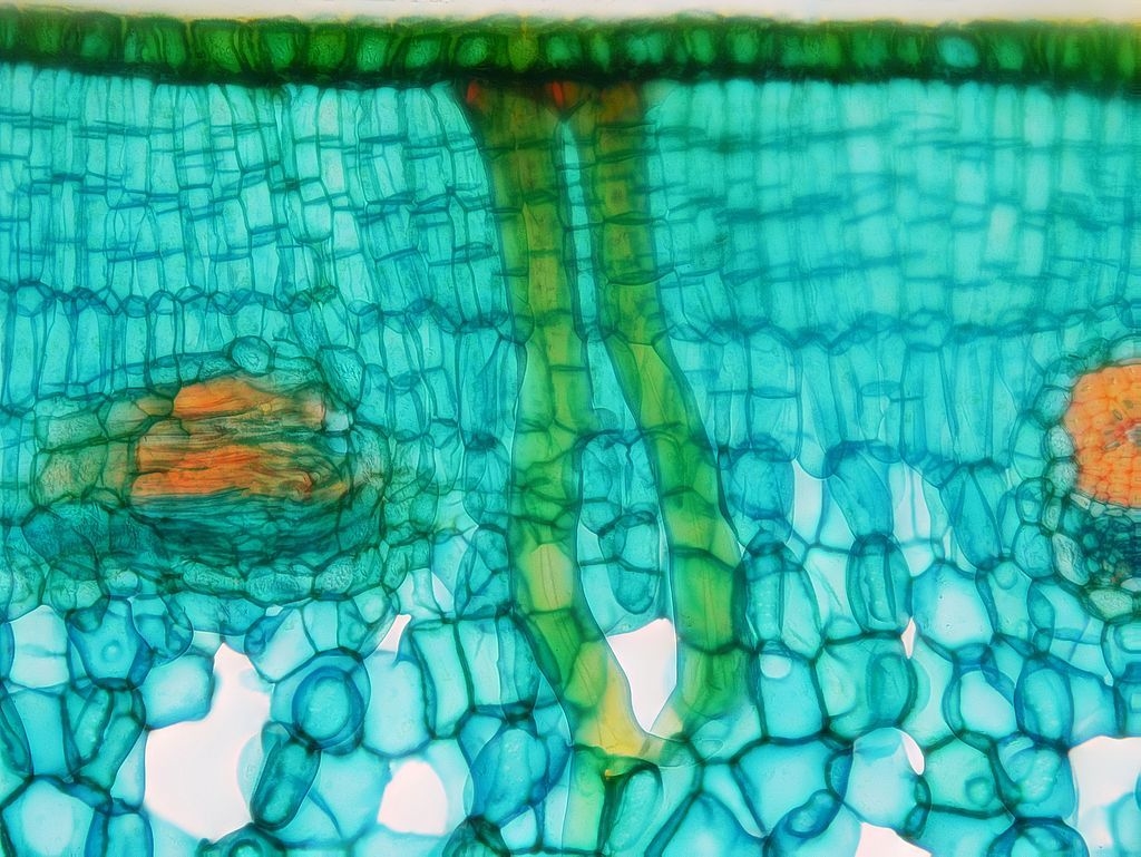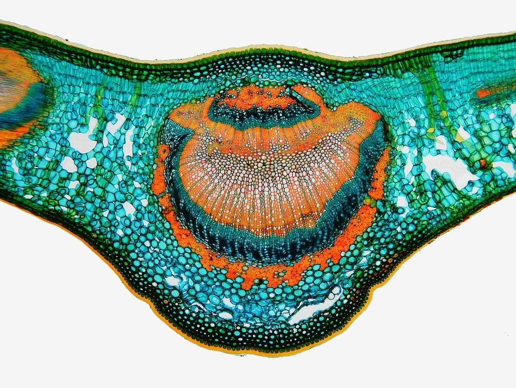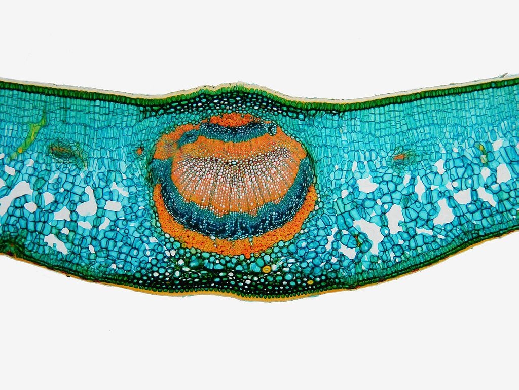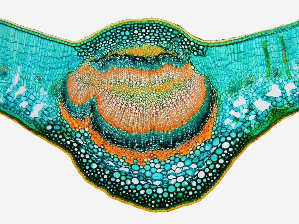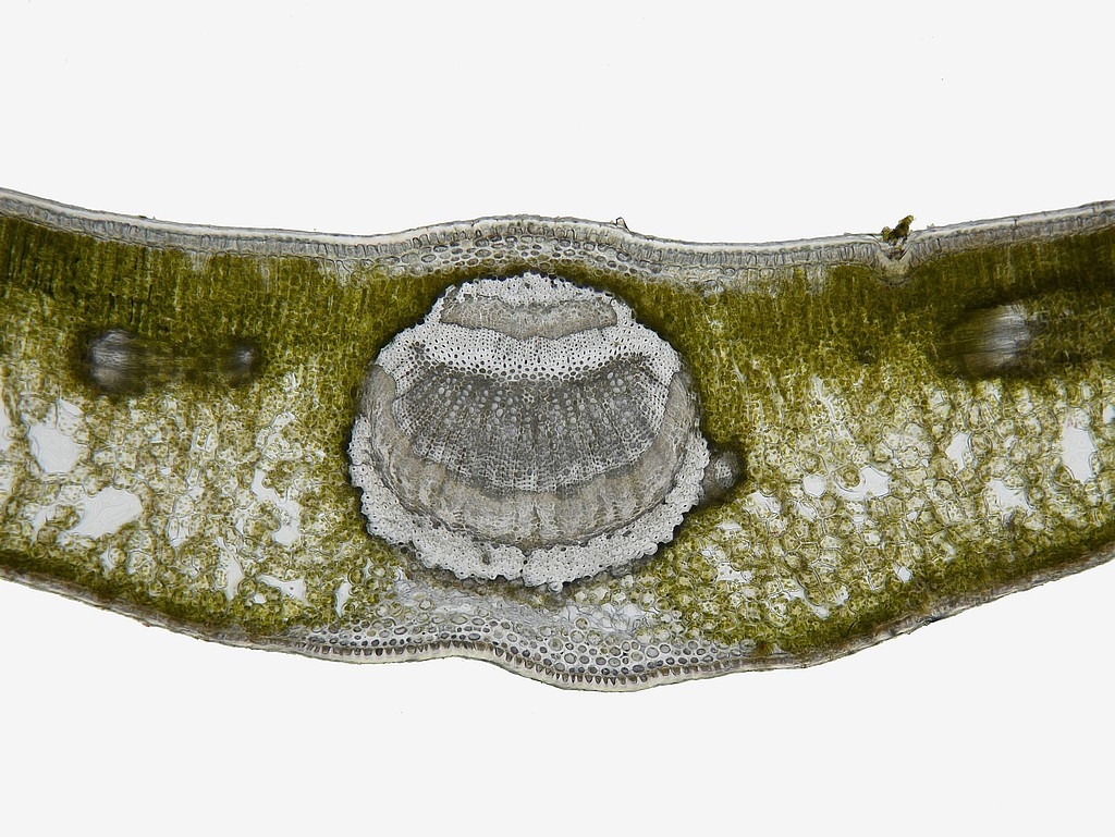 Betrachten wir zunächst die Mittelrippe: unter einer stark ausgeprägten Cuticula (Cu) folgen die Epidermis (Ep) und eine kleine Gruppe Kollenchymzellen (Kol). Das Leitbündel hat einen symmetrischen Aufbau: es besteht, von oben nach unten, aus zwei Gruppen die sandwichartig übereinander liegen: wir finden Sklerenchym (Skl), Phloem (Pl) und Xylem (Xl) und dann in umgekehrter Reihenfolge und deutlich größer Xylem, Phloem und Sklerenchym. Dabei zeigt es sich, dass am Sklerenchym oben und unten zerstörte Phloemzellen anliegen (dPl, disfunktionales Phloem). Nach unten hin folgen dann wieder Kollenchym, Epidermis und die an der Blattunterseite deutlich dünnere Cuticula.