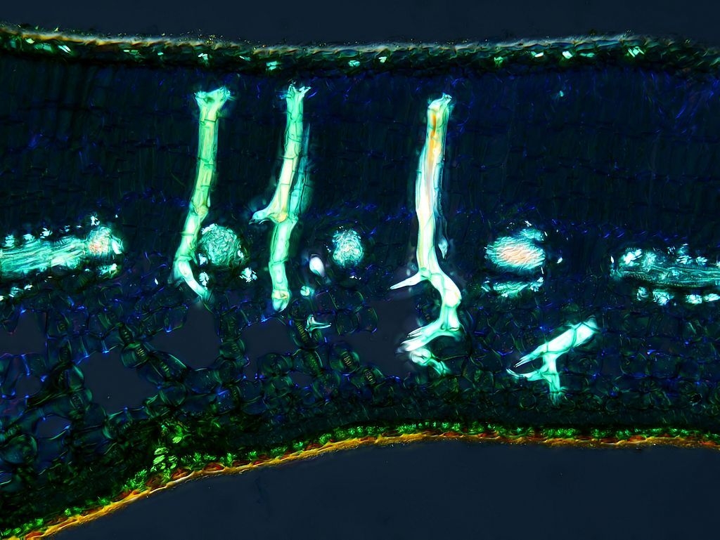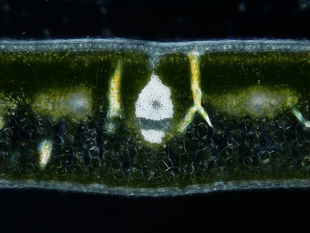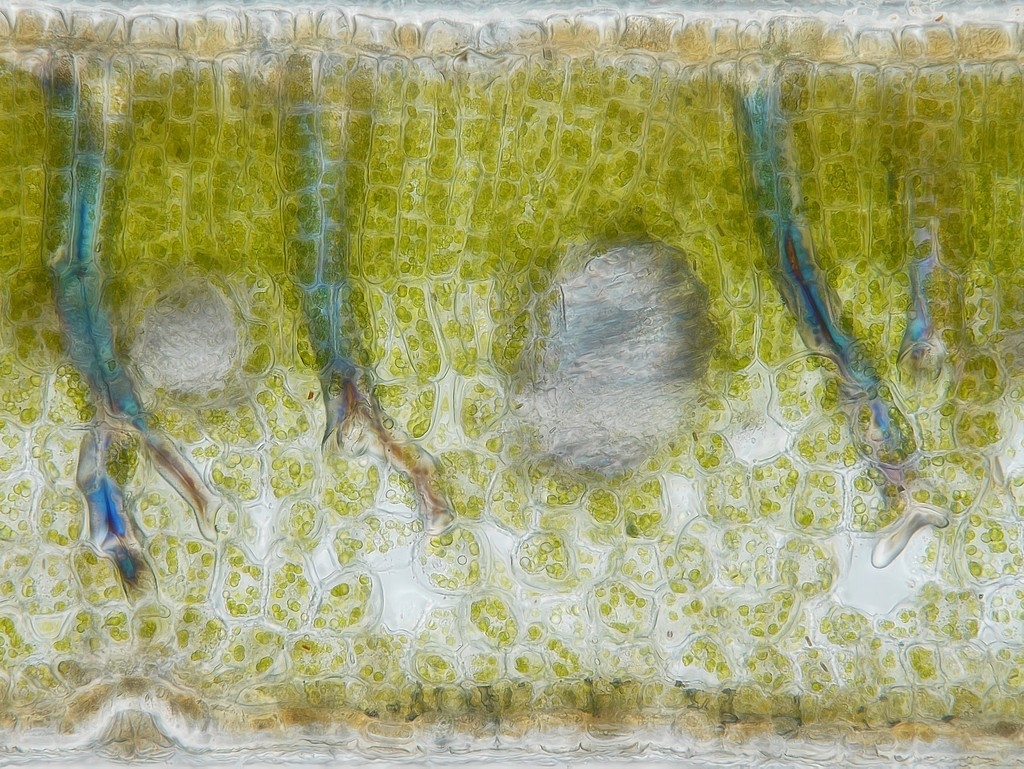 Spannend wird es, wenn wir uns die Blattspreite anschauen, die bis über 600 µm dick sein kann: neben dem hier vorhandenen mehrreihigen Assimilationsparenchym (AP) und dem ausgeprägten Schwammparenchym (SP) sehen wir auch die Sklereiden, wegen derer ich die Schnitte präpariert habe. Da das Lignin der Zellwände doppelbrechend ist, habe ich einige Aufnahmen mit parallelen Polfiltern gemacht: die Sklereiden erscheinen dabei bläulich. Bei gekreuzten Polfiltern treten sie, wie alle anderen ligninhaltigen Strukturen auch, hell leuchtend hervor.